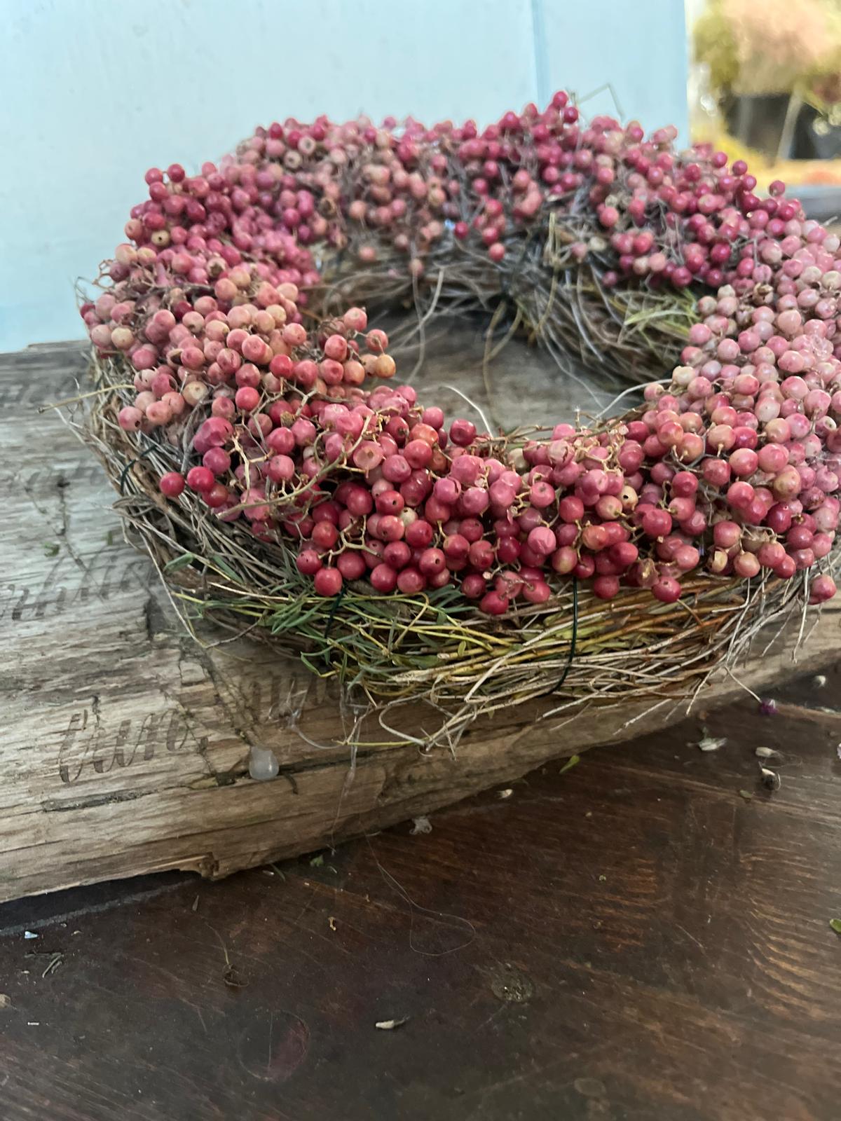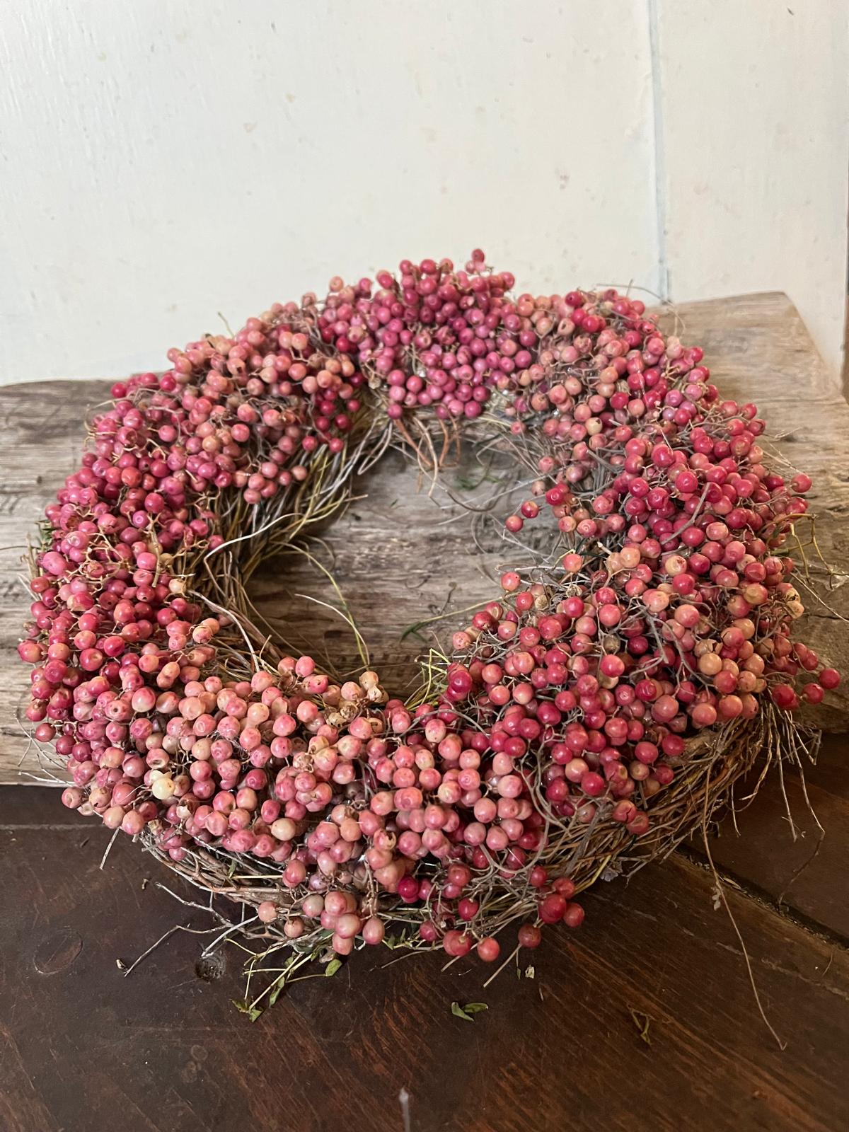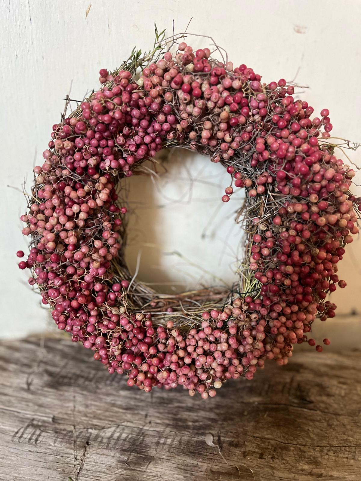 Ein Kranz, der Charakter zeigt! Dieses besondere Stück wird von uns mit viel Liebe zum Detail von Hand gebunden und kombiniert die leuchtenden Beeren des Rosa Pfeffers mit frischem, duftendem Thymian. Ein rustikales und zugleich edles Deko-Highlight.