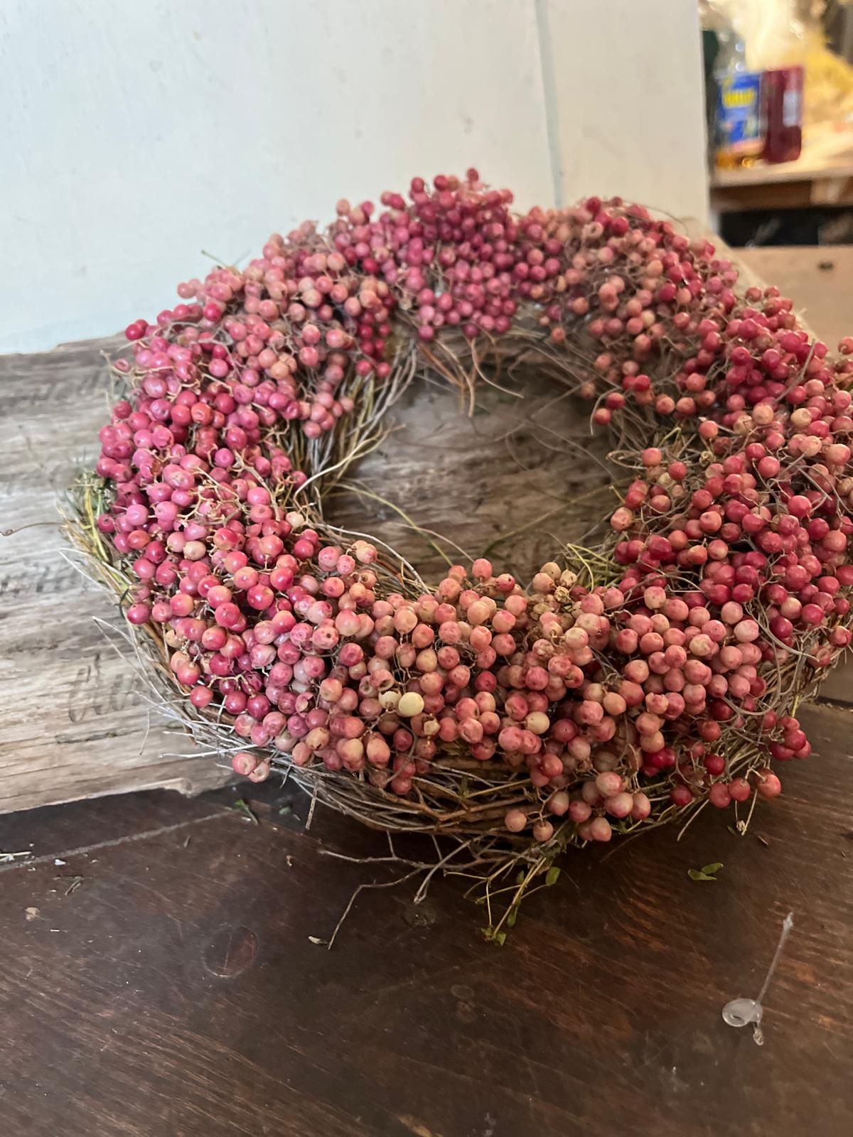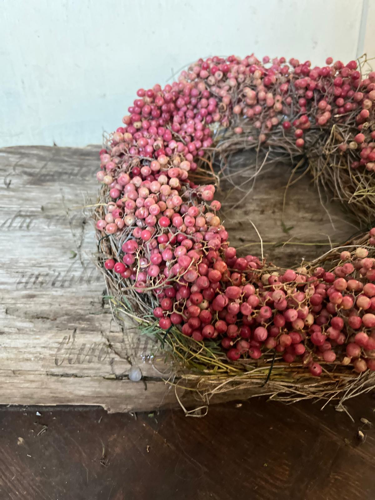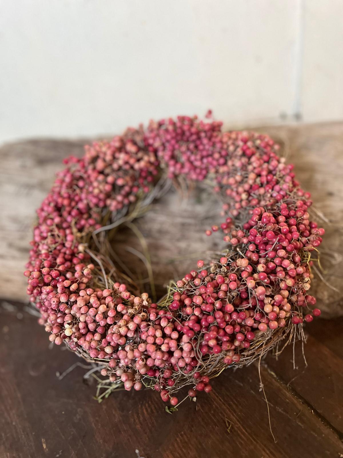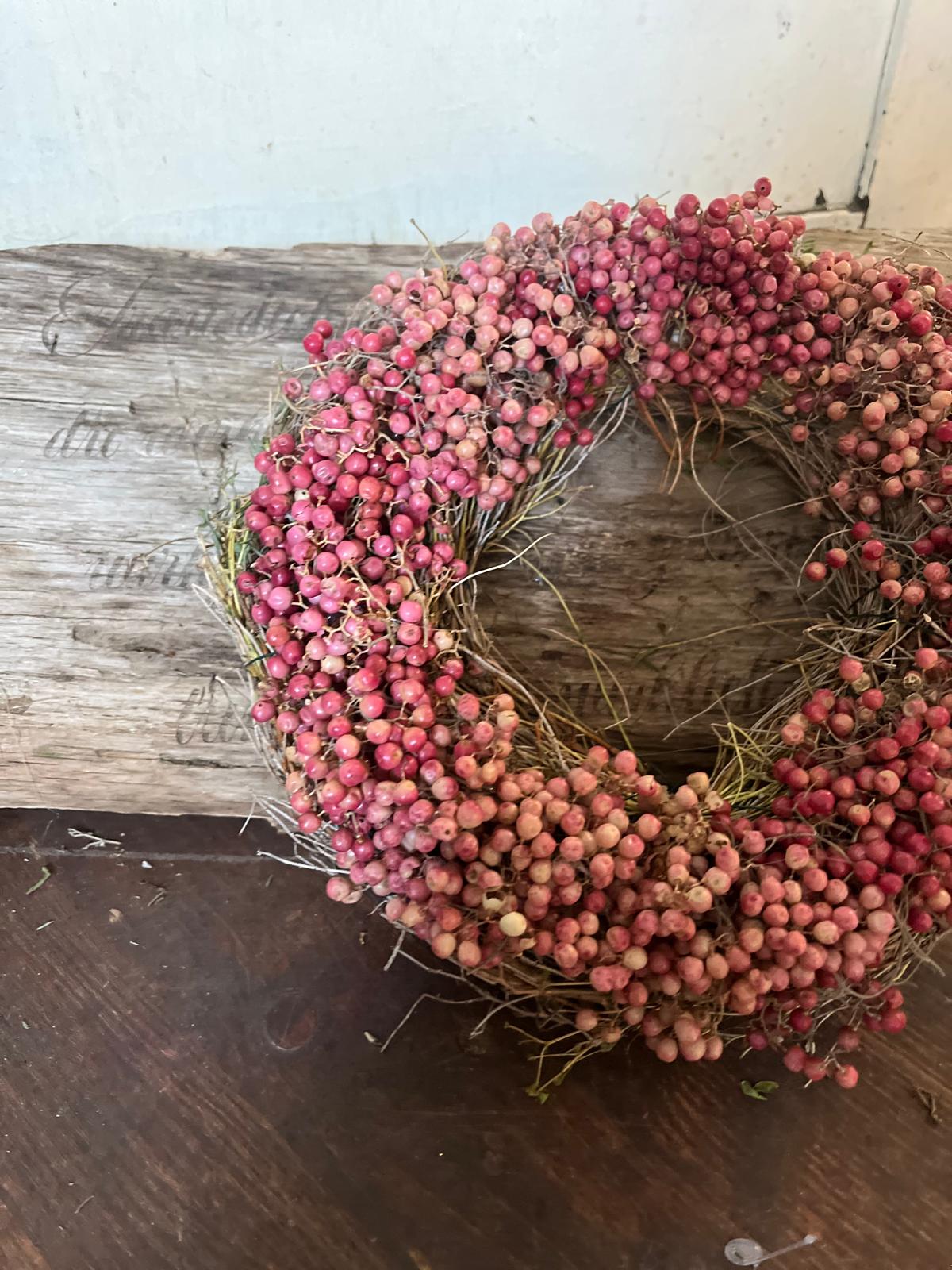 Ein Kranz, der Charakter zeigt! Dieses besondere Stück wird von uns mit viel Liebe zum Detail von Hand gebunden und kombiniert die leuchtenden Beeren des Rosa Pfeffers mit frischem, duftendem Thymian. Ein rustikales und zugleich edles Deko-Highlight.