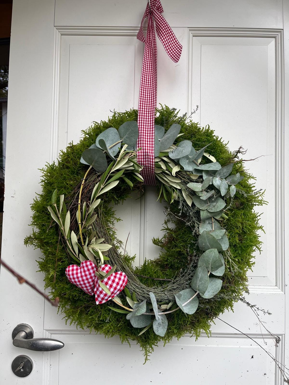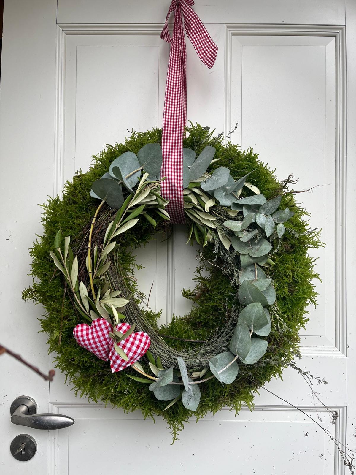 Handgemachter Mooskranz mit Eukalyptus, Olive, Thymian & Herzen | Dekorativer Kranz mit Band