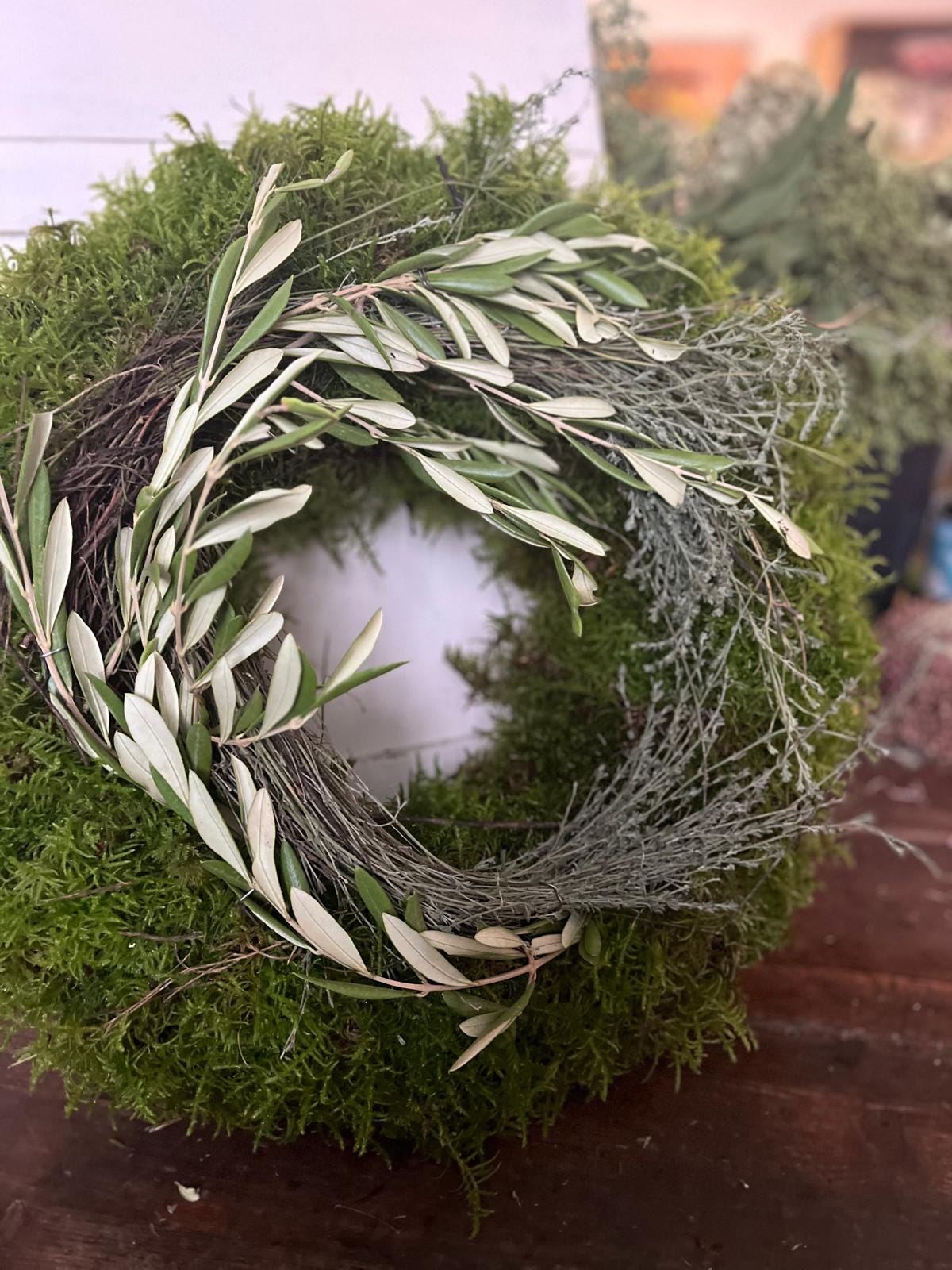 Handgemachter Mooskranz mit Olive und Thymian | Natürlicher Kranz für Heim- & Tischdekoration | Rustikales Grün