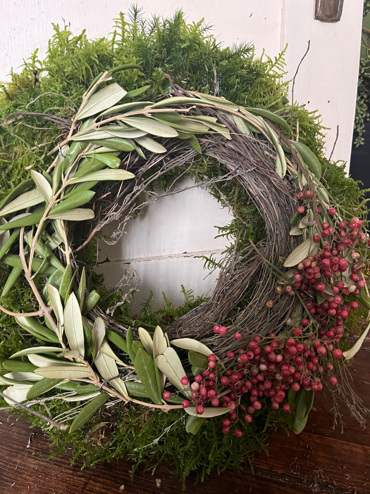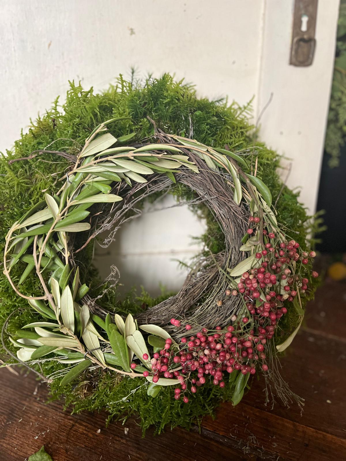 Handgemachter Mooskranz mit Thymian, Olive und rosa Pfeffer | Naturkranz für Heimdekoration | Rustikaler Türkranz