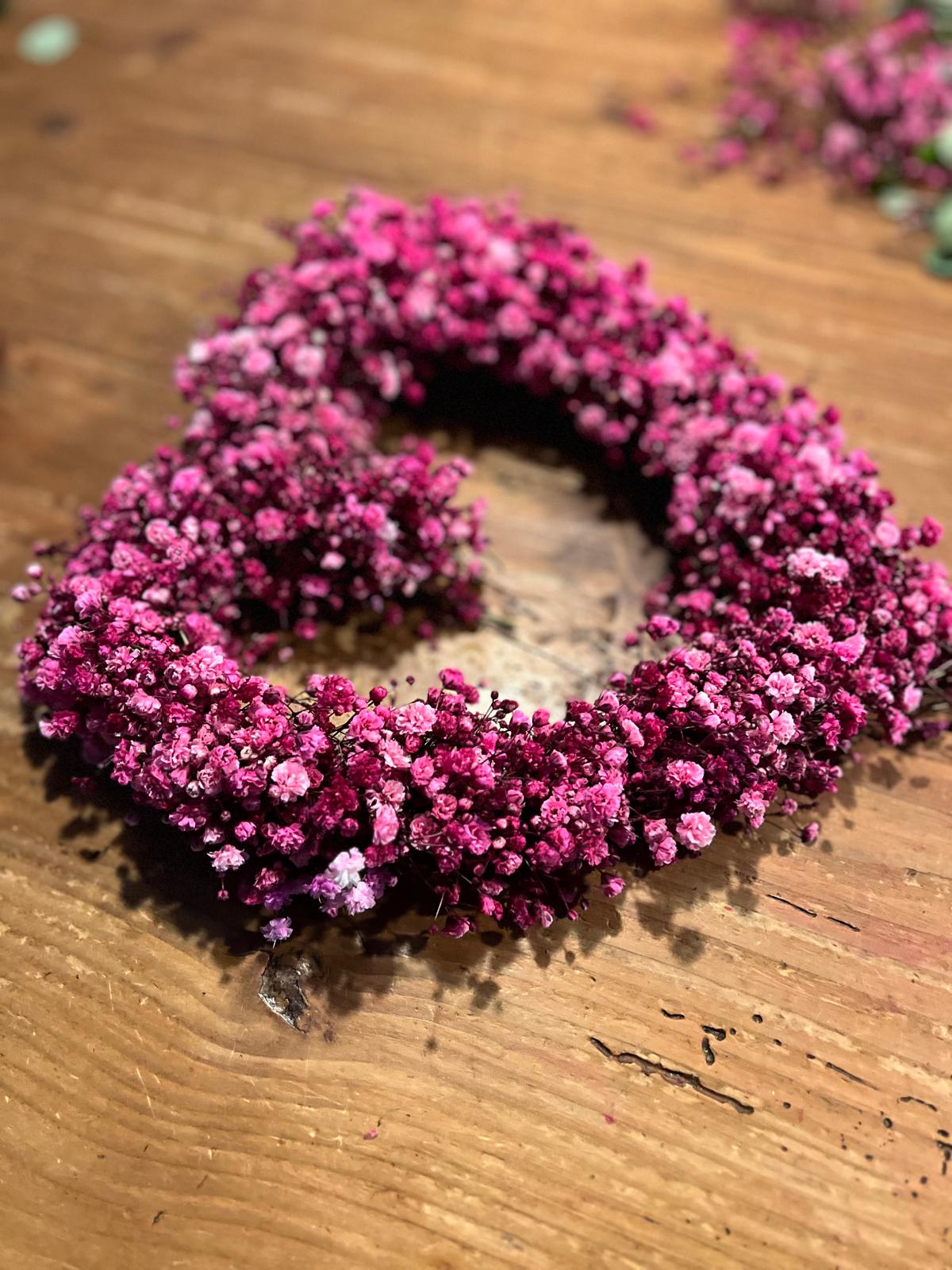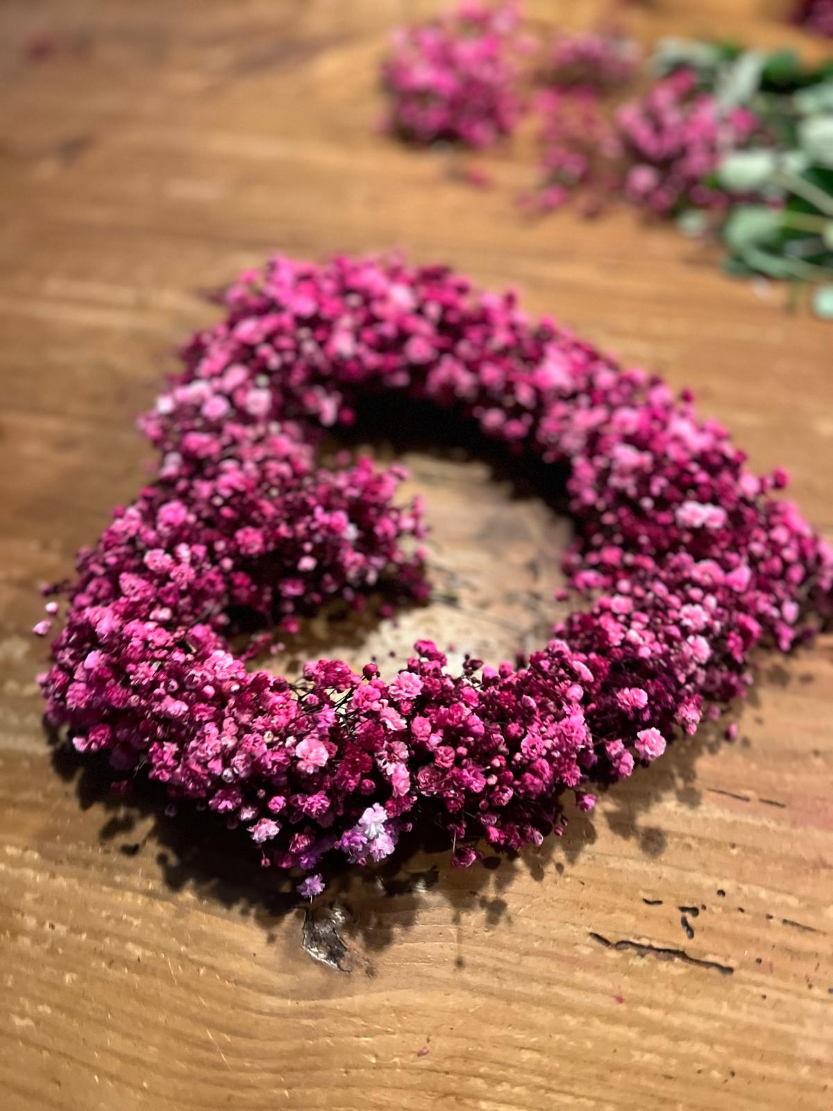 Dieses liebevoll gefertigte Herz aus Schleierkraut und grünem Naturmaterial ist eine zarte und zeitlose Dekoration zum Aufhängen – sei es an der Tür, am Fenster oder als Wanddeko.