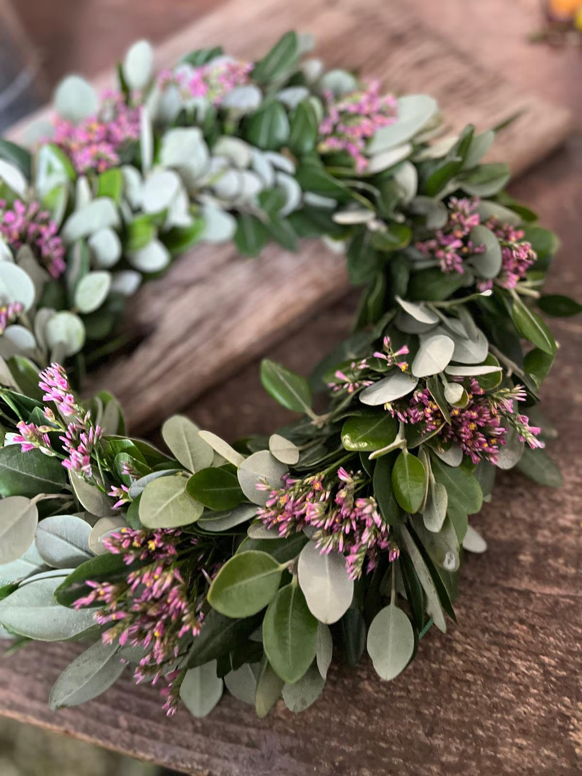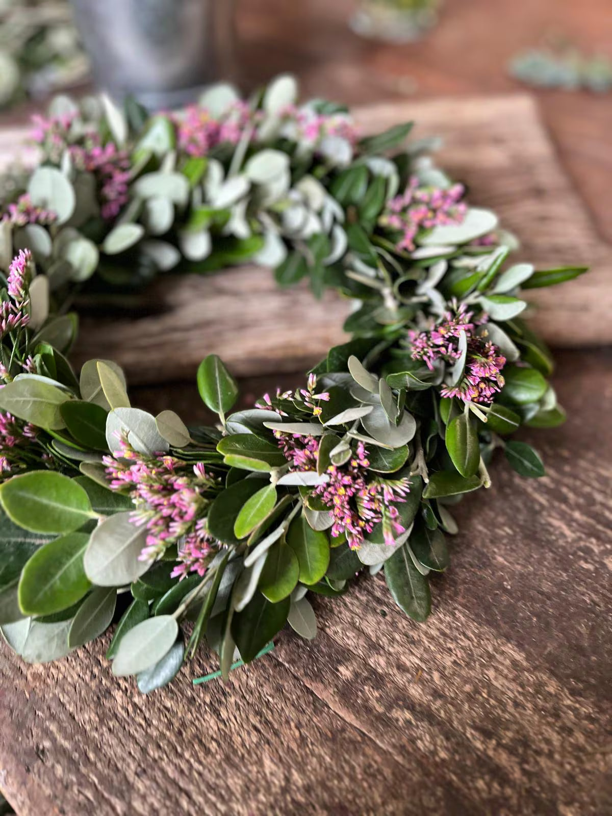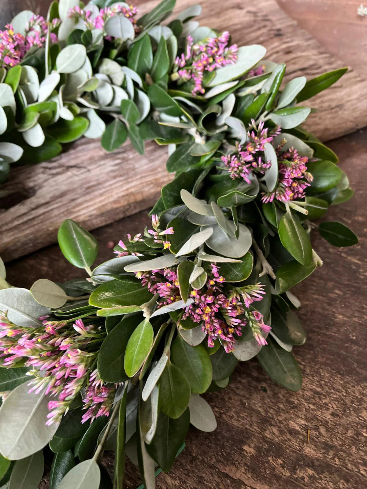 Ein handgefertigter Kranz aus natürlichen Eichenblättern, zarter Wachsblume, Ideal für eine rustikale und elegante Dekoration.