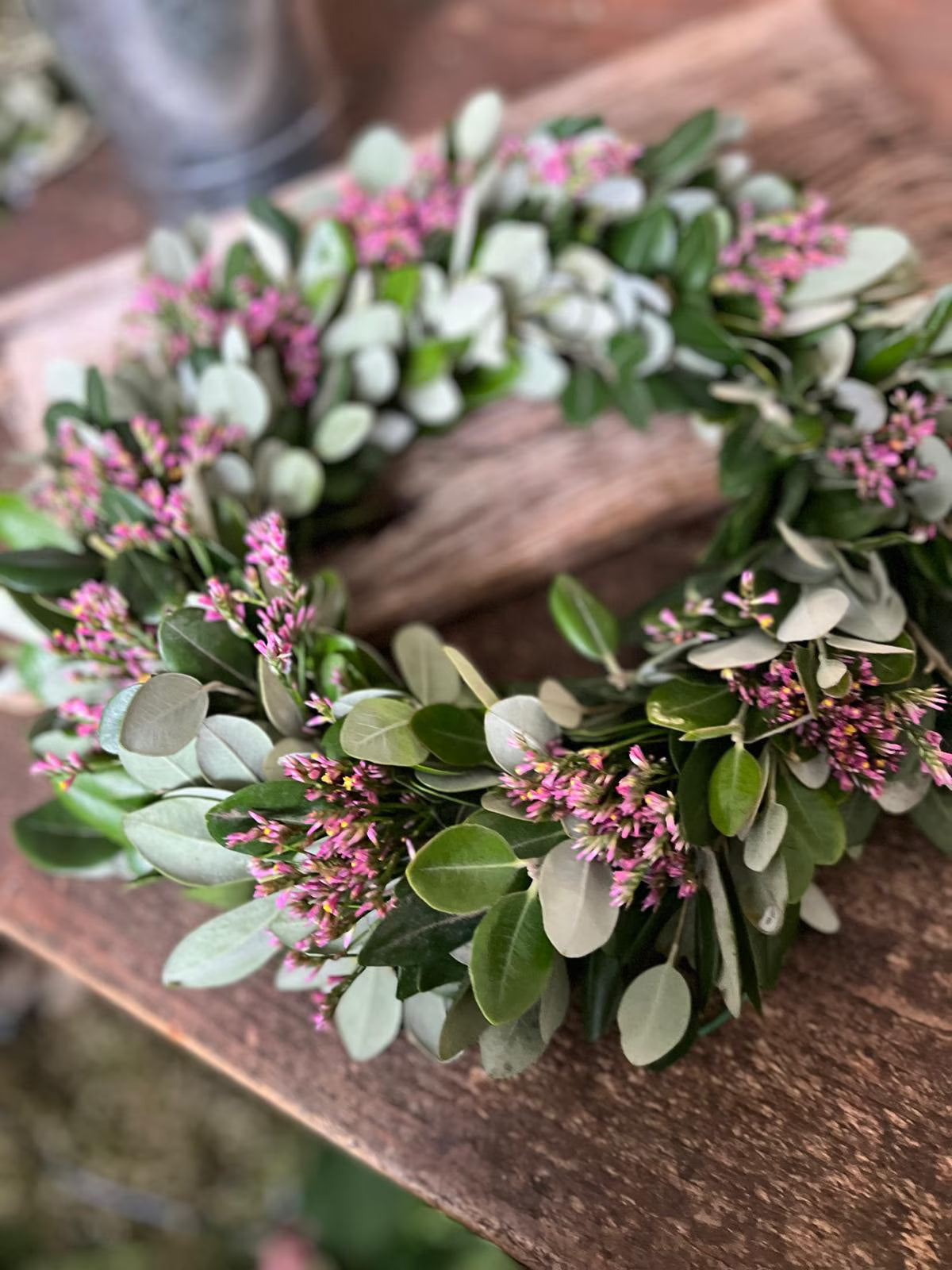 Kranz mit Eichenblättern, Wachsblume, Schleierkraut & Disteln