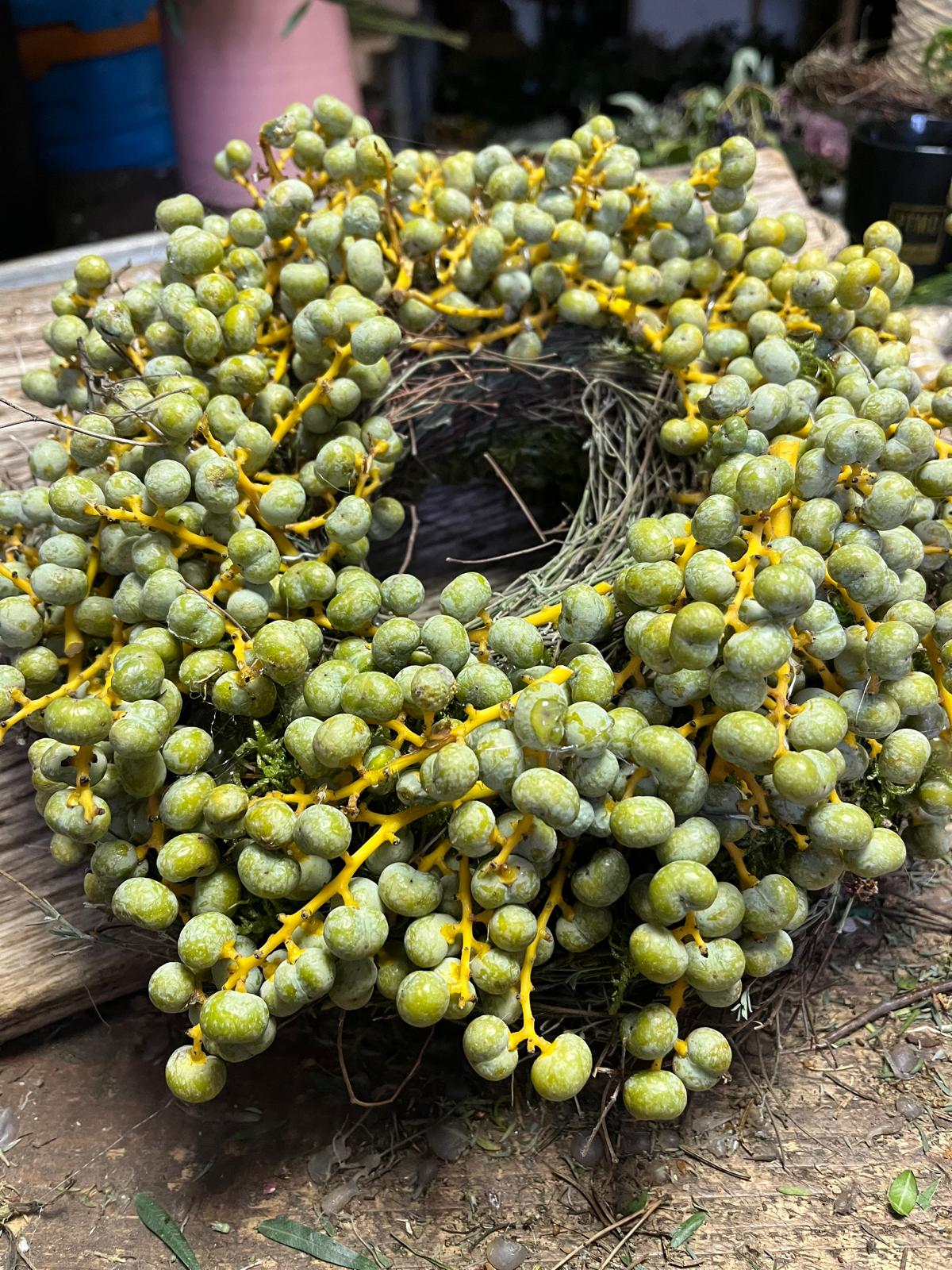 Dieser handgefertigte Kranz ist eine schöne Deko-Idee, die eine einzigartige und natürliche Atmosphäre schafft. Er wurde aus einer besonderen Kombination von Materialien gefertigt: Frisches Moos, duftender Thymian und dekorative, getrocknete Datteln verleihen ihm einen rustikalen und zugleich ungewöhnlichen Charme.