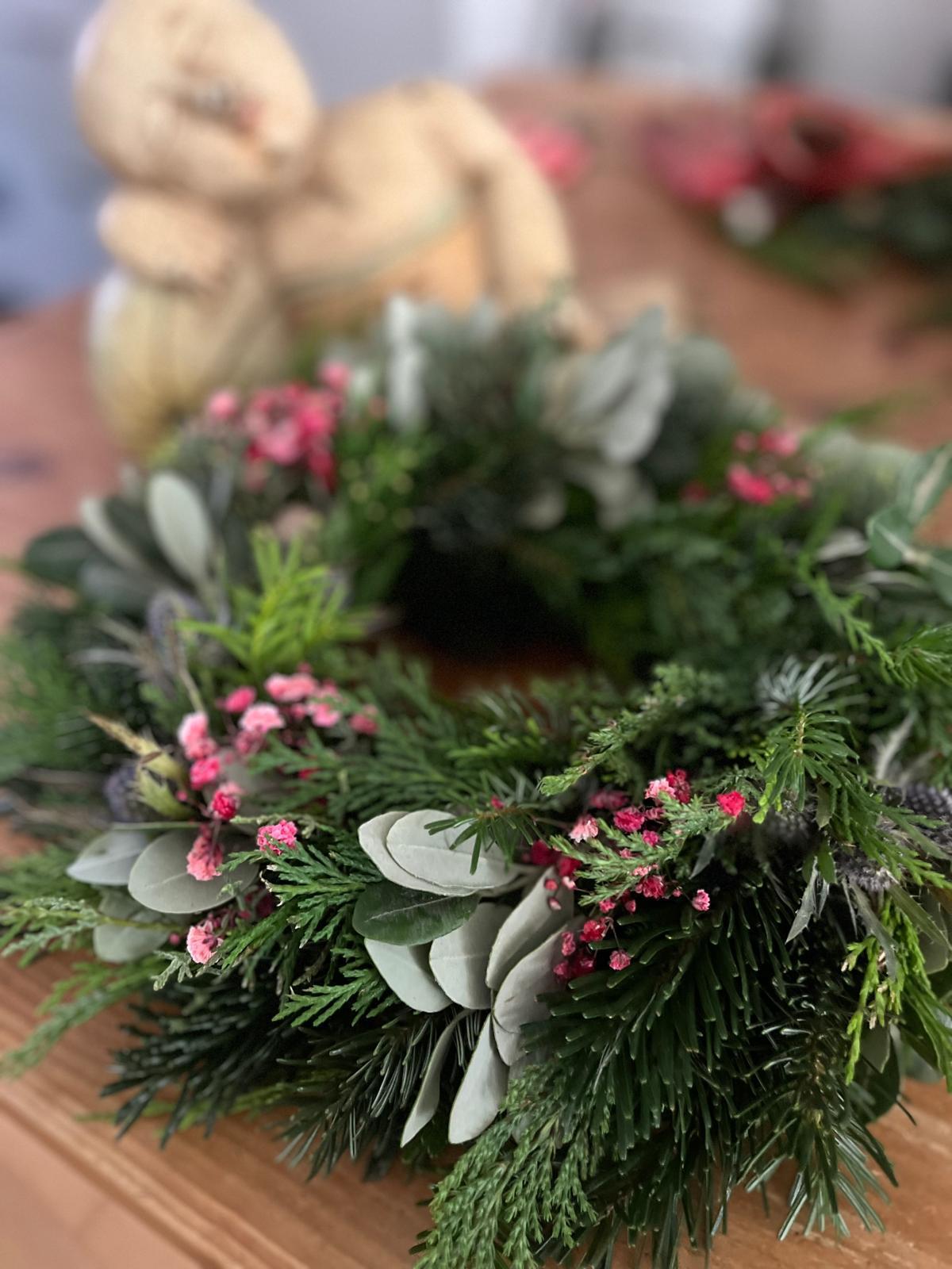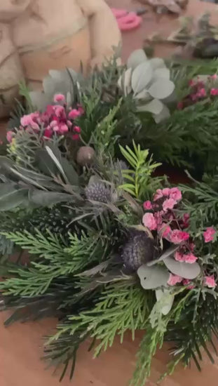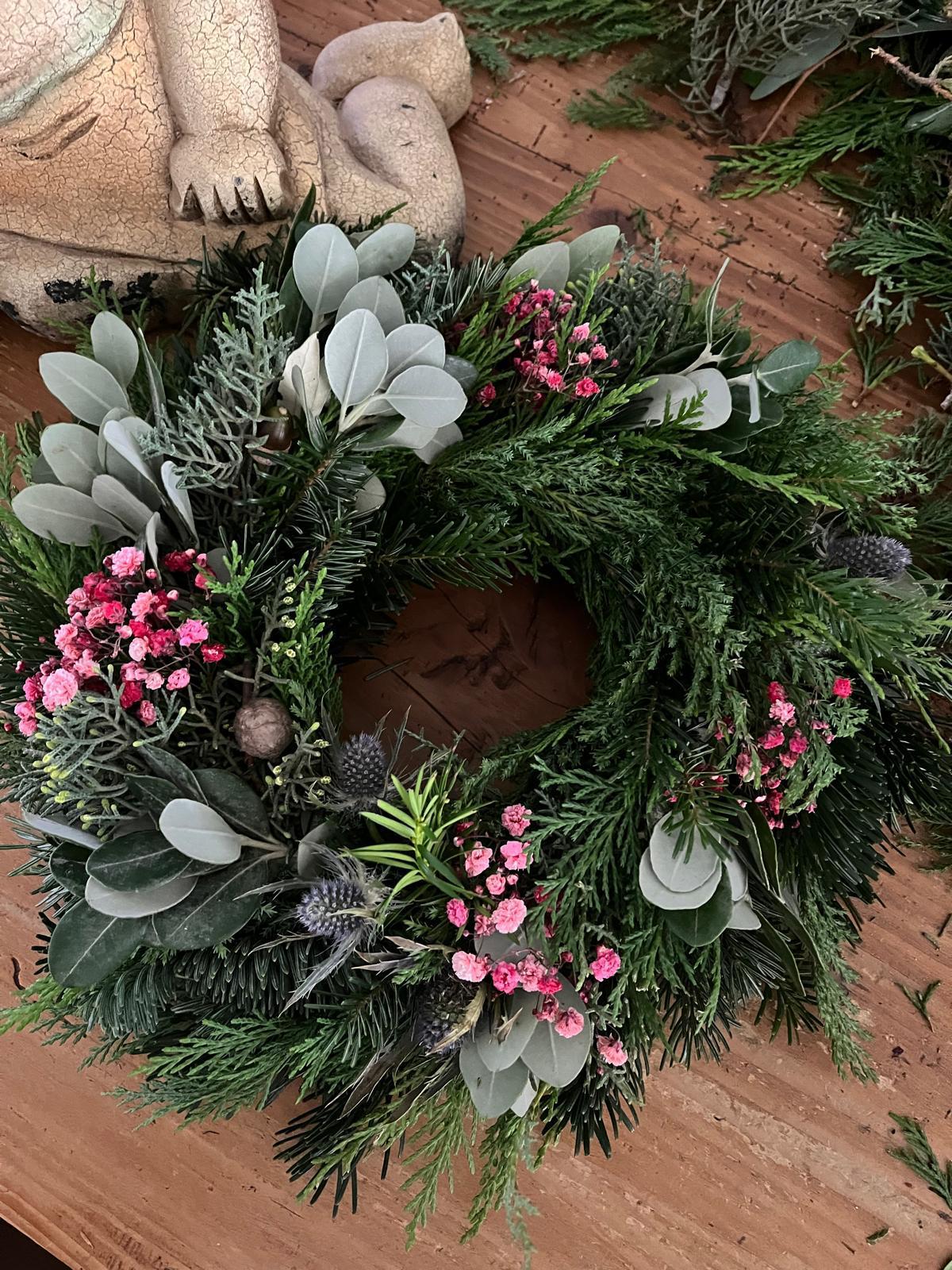 Verleihen Sie Ihrer Tür oder Ihrem Tisch einen festlichen und zugleich natürlichen Charme mit diesem exklusiven, frisch gebundenen Deko-Kranz. Ideal als einladender Türkranz oder als stilvolle Adventsdeko, die alle Blicke auf sich zieht.