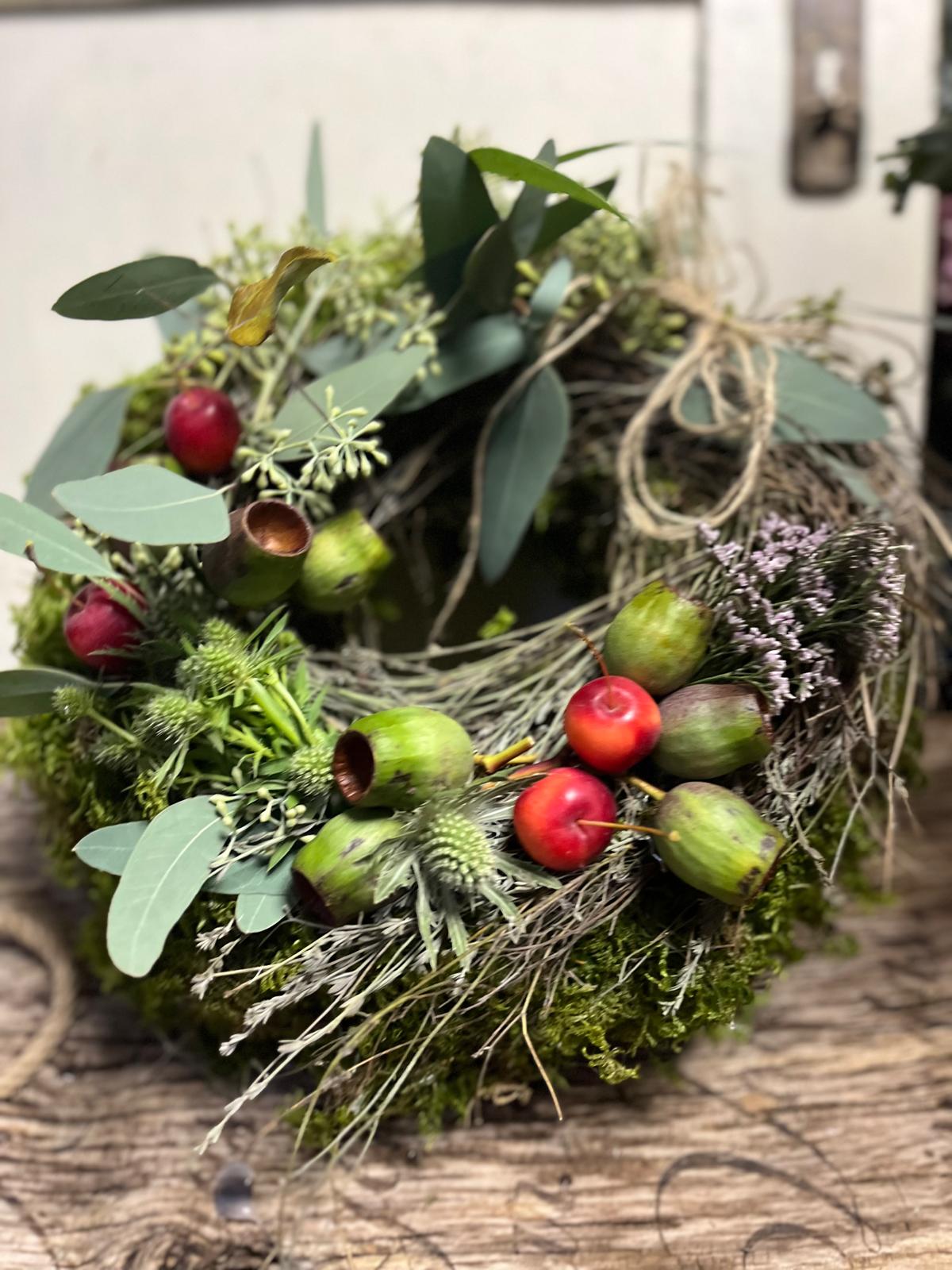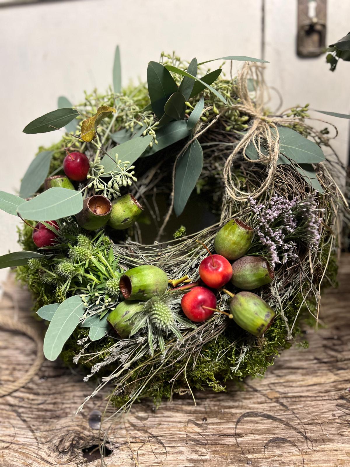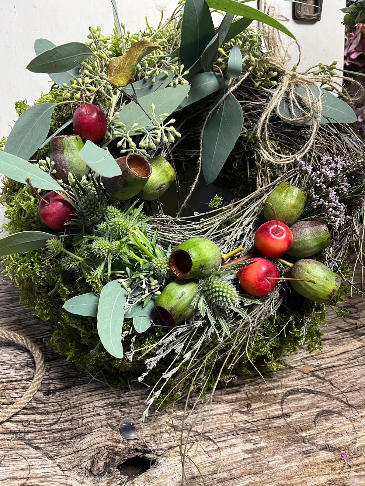 Material: Eukalyptus, Disteln, getrocknete Äpfel, Strandflieder, Moos