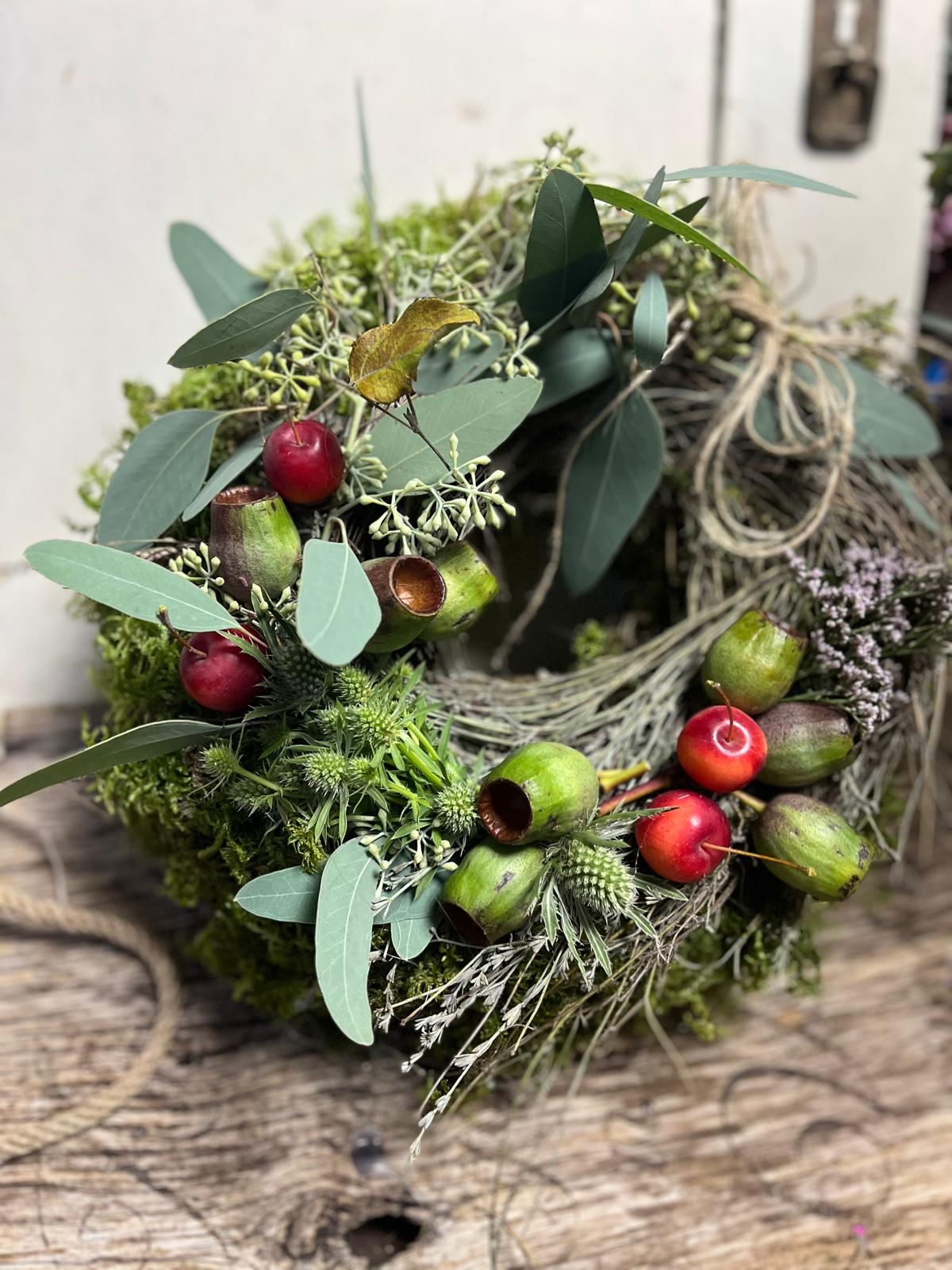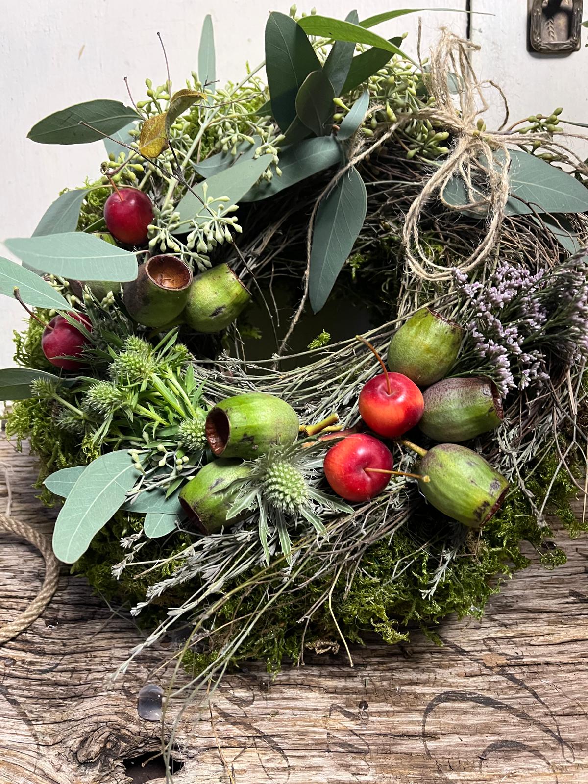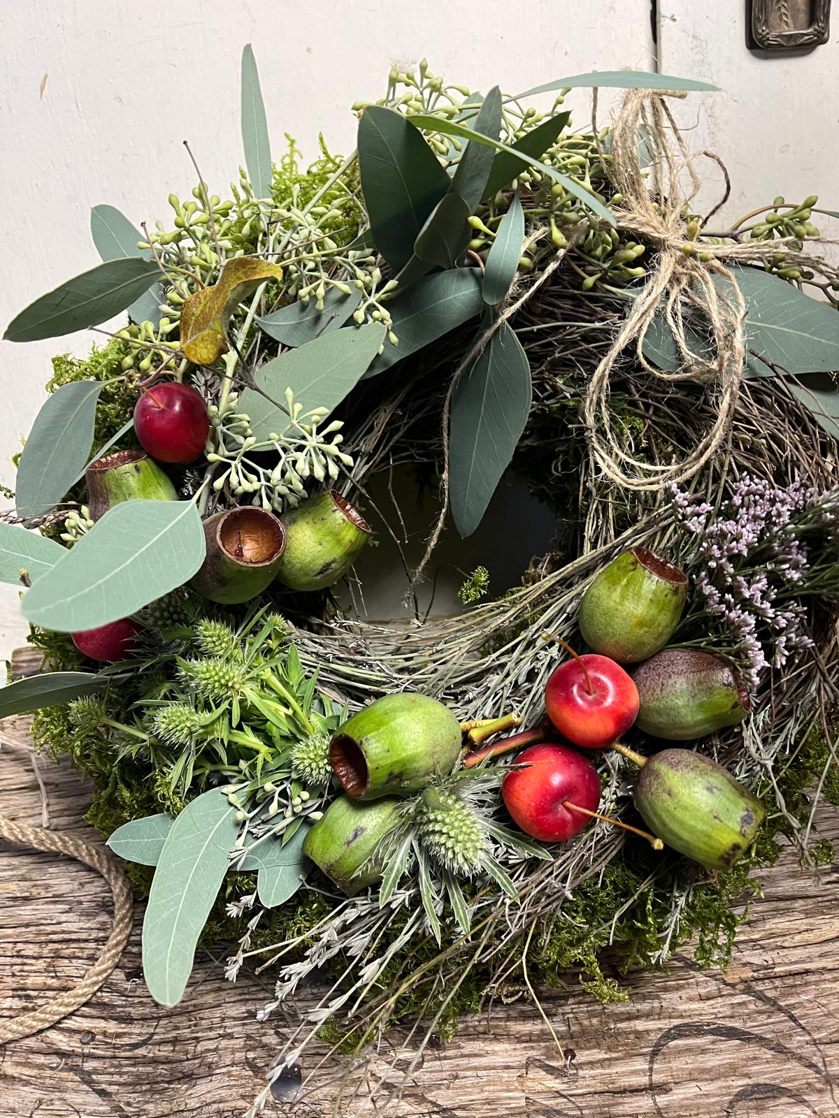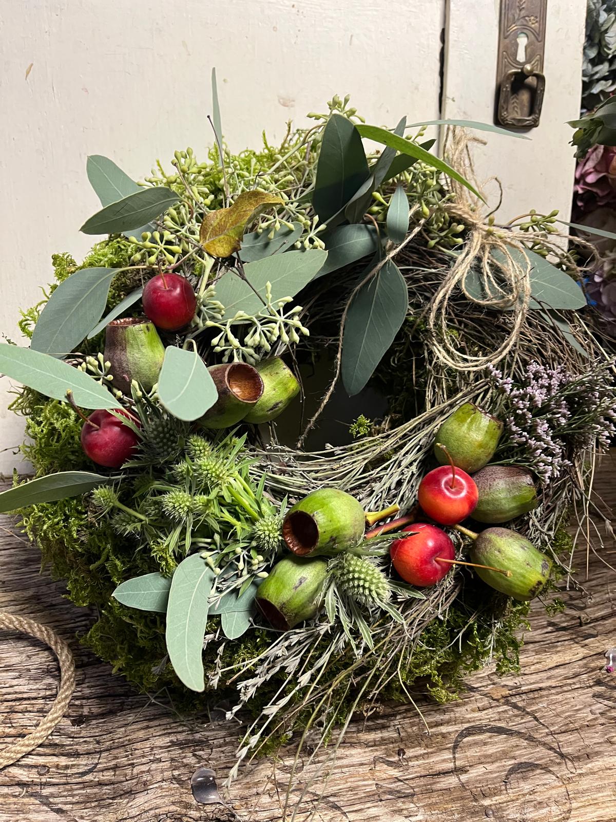 Material: Eukalyptus, Disteln, getrocknete Äpfel, Strandflieder, Moos