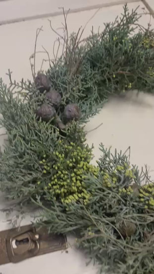 Frisch gebundener Kranz mit duftendem Thymian und edler Arizonica-Zypresse mit Früchten
