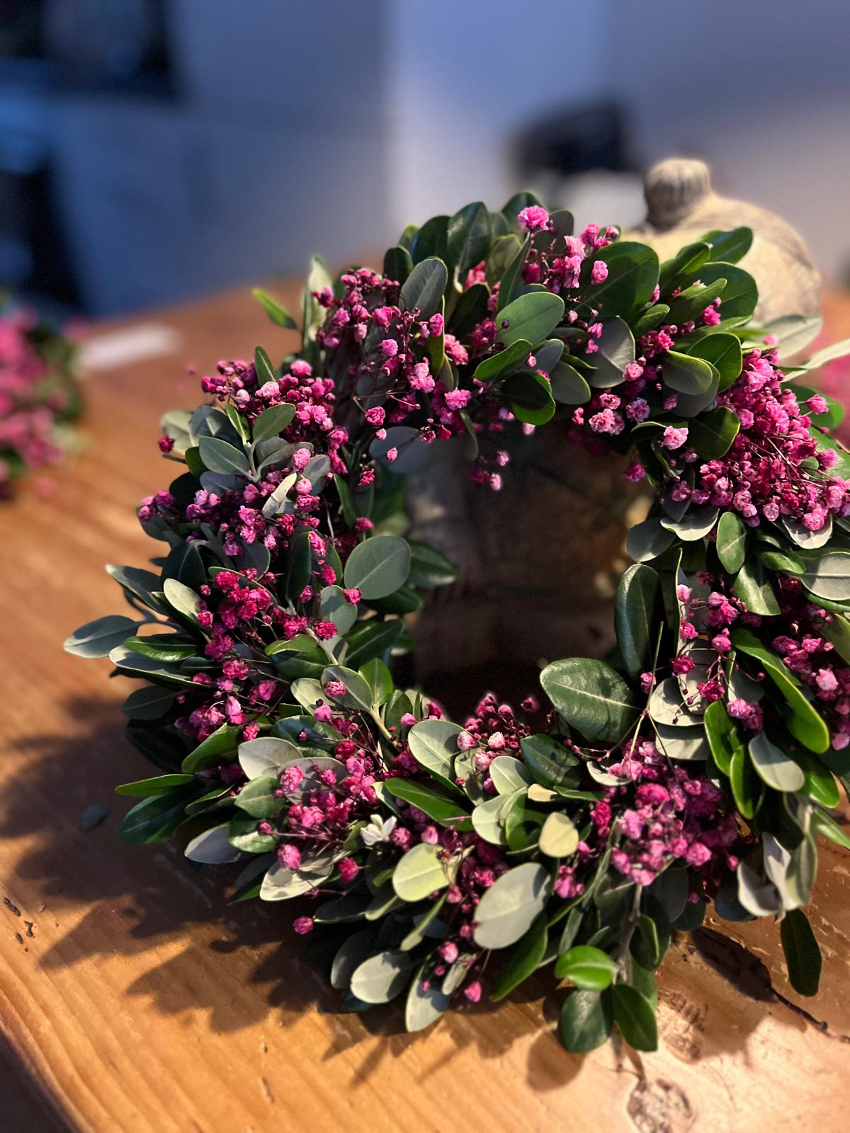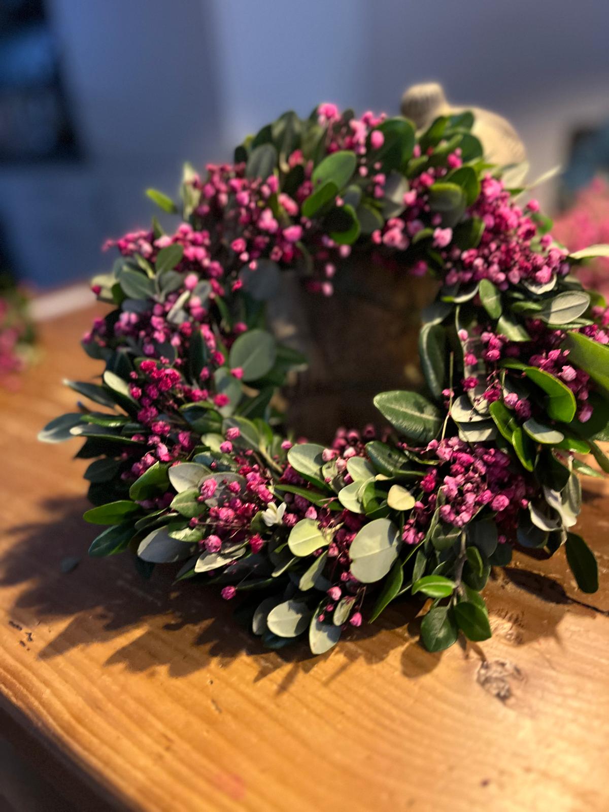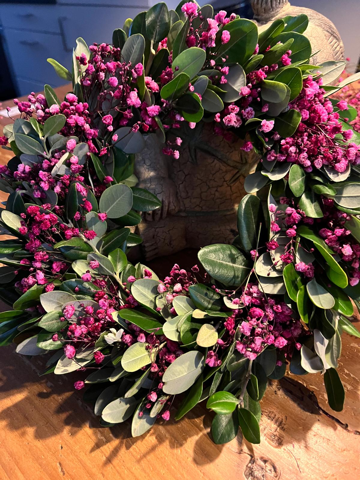 Ein zarter Kranz aus frischem Schleierkraut und grünem Beiwerk, handgefertigt mit Liebe zum Detail.