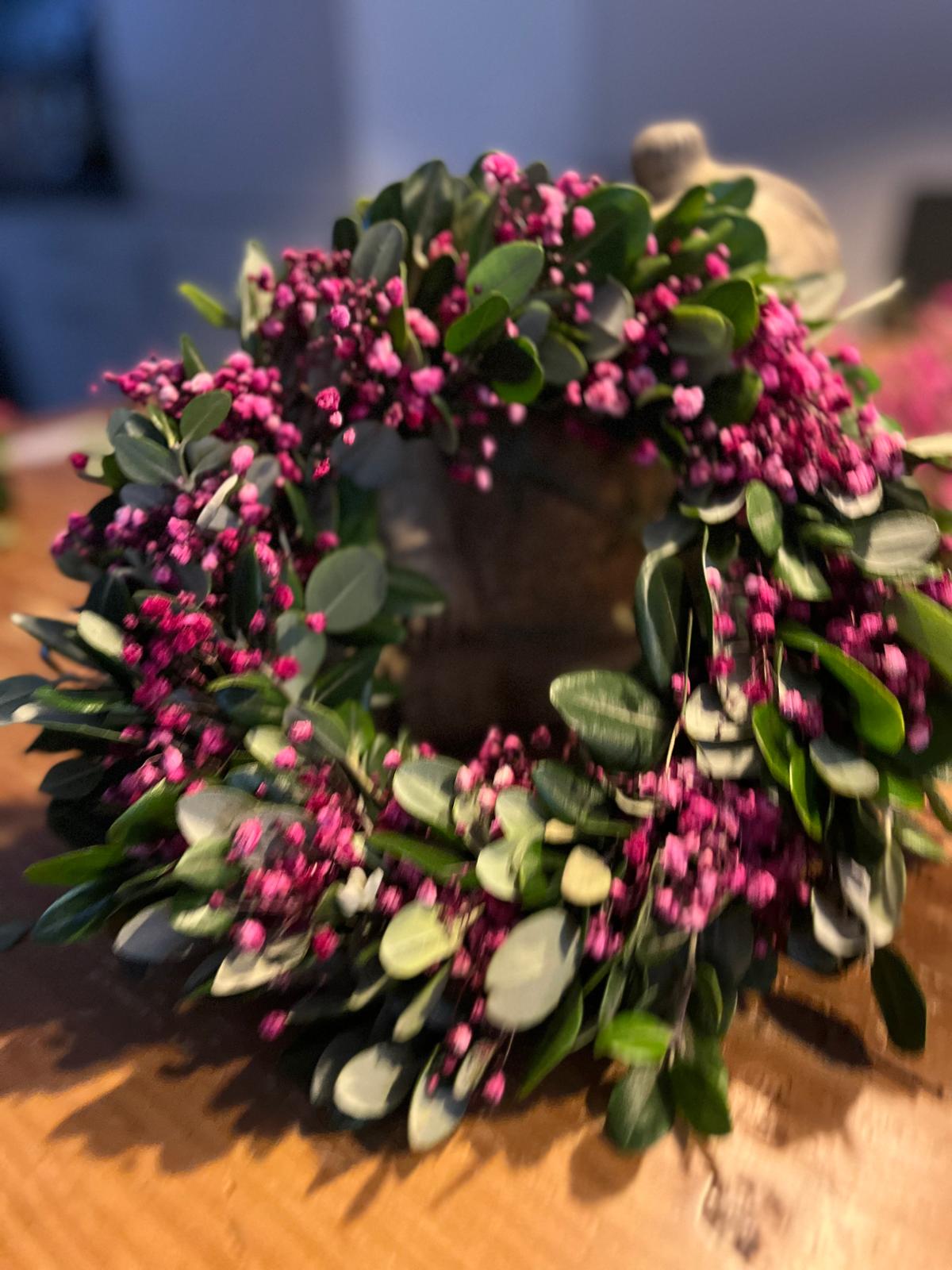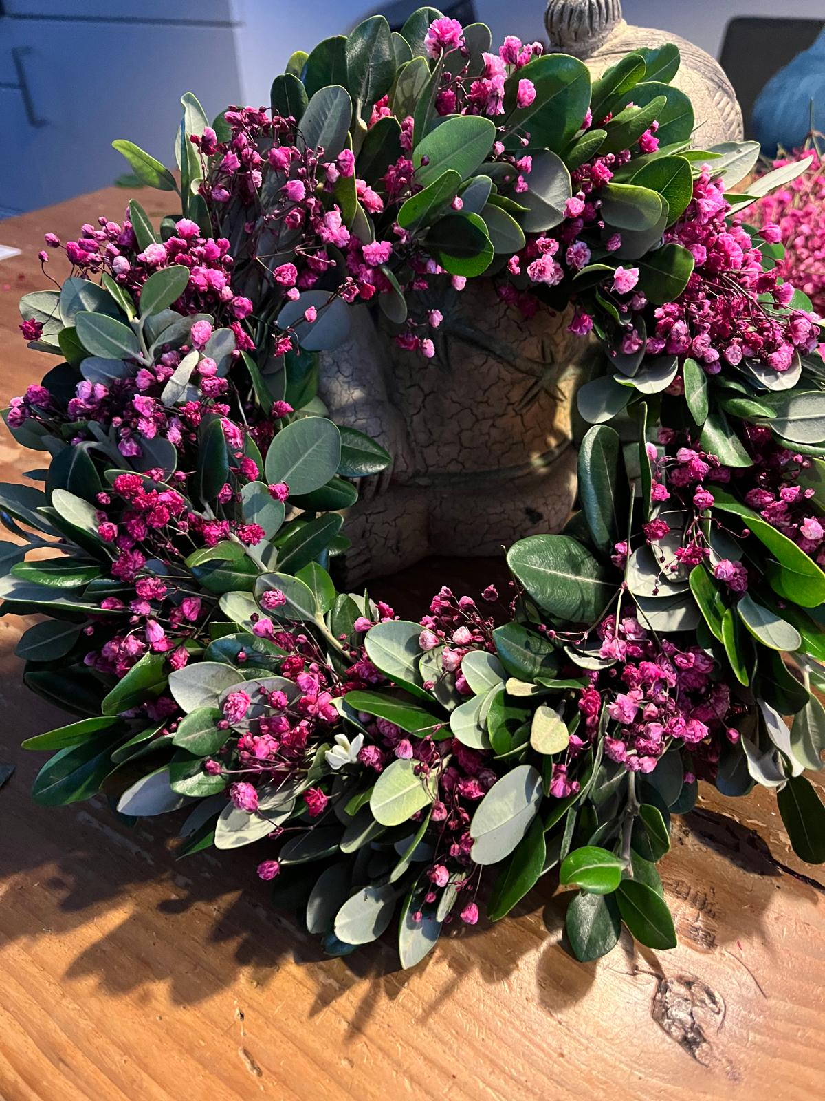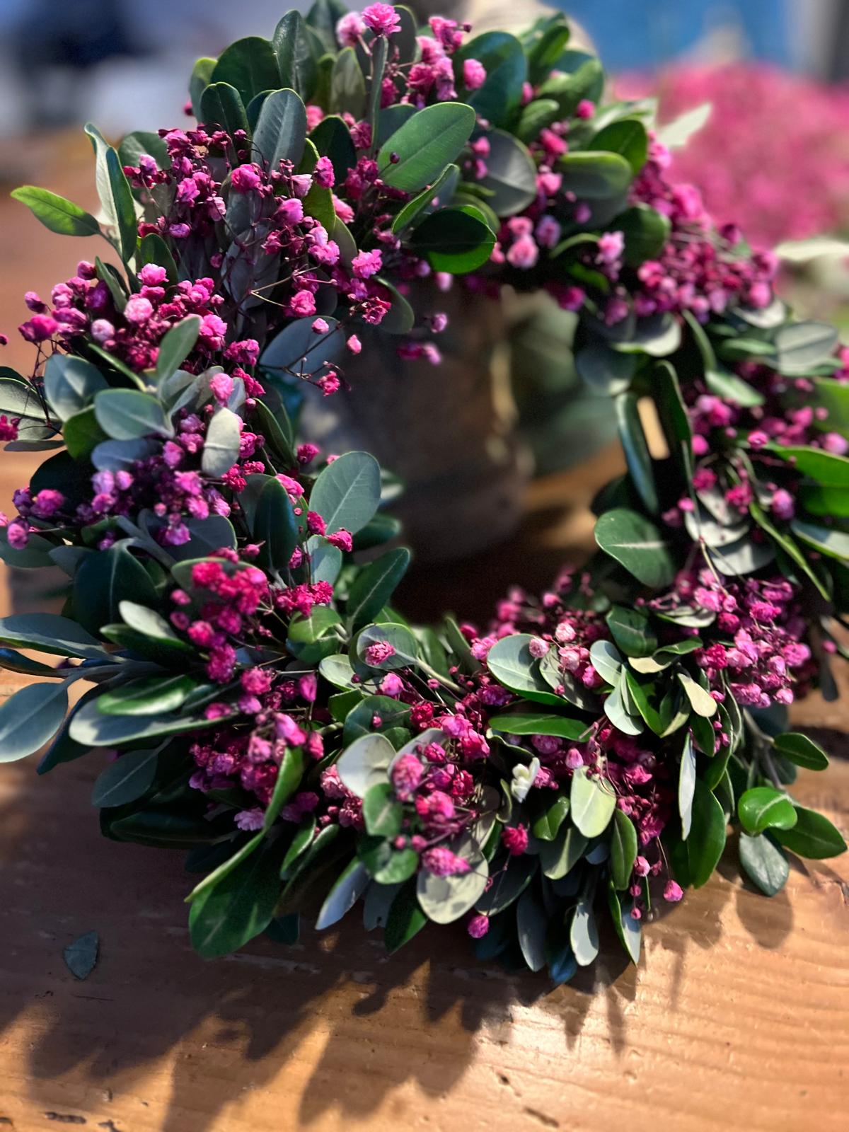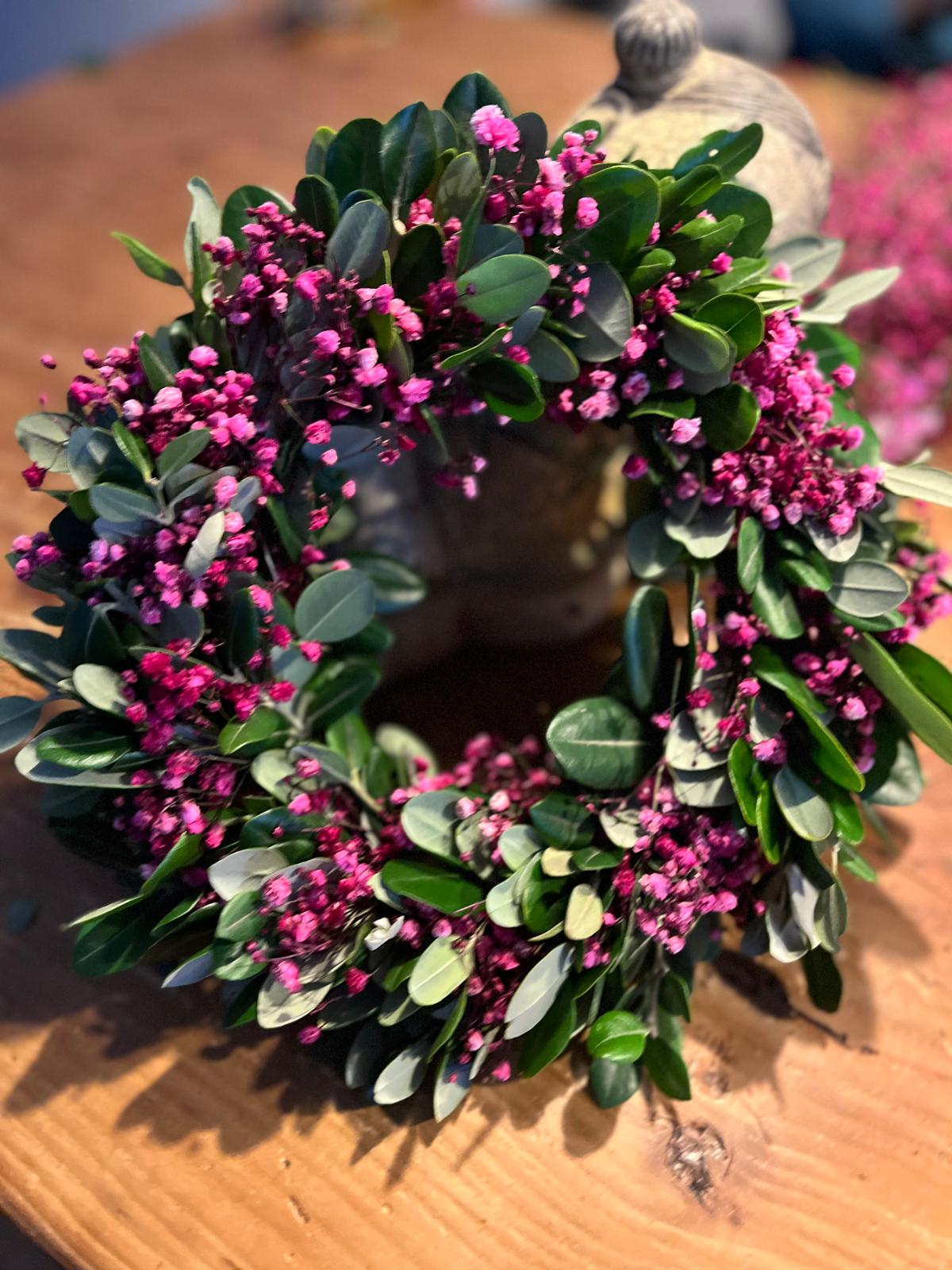 Ein zarter Kranz aus frischem Schleierkraut und grünem Beiwerk, handgefertigt mit Liebe zum Detail.