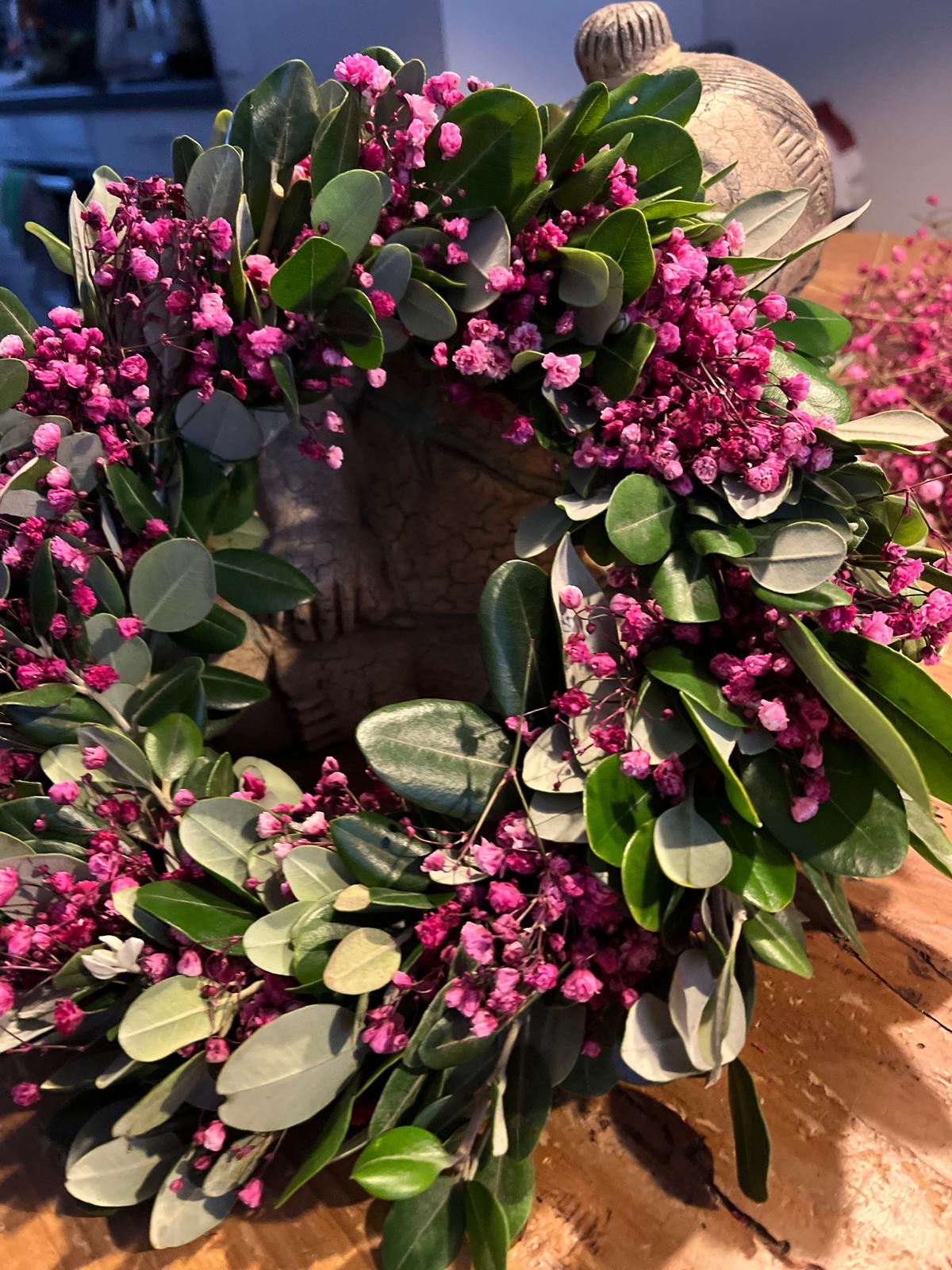 Der Kranz wird frisch gebunden und trocknet wunderschön ein – dadurch bleibt er über lange Zeit dekorativ.