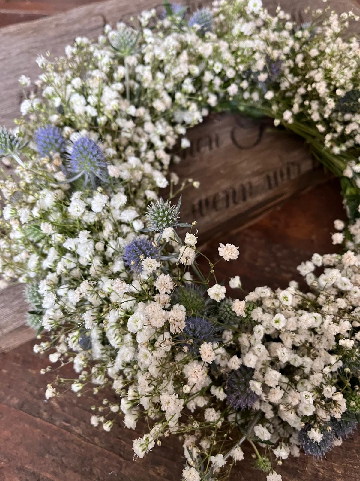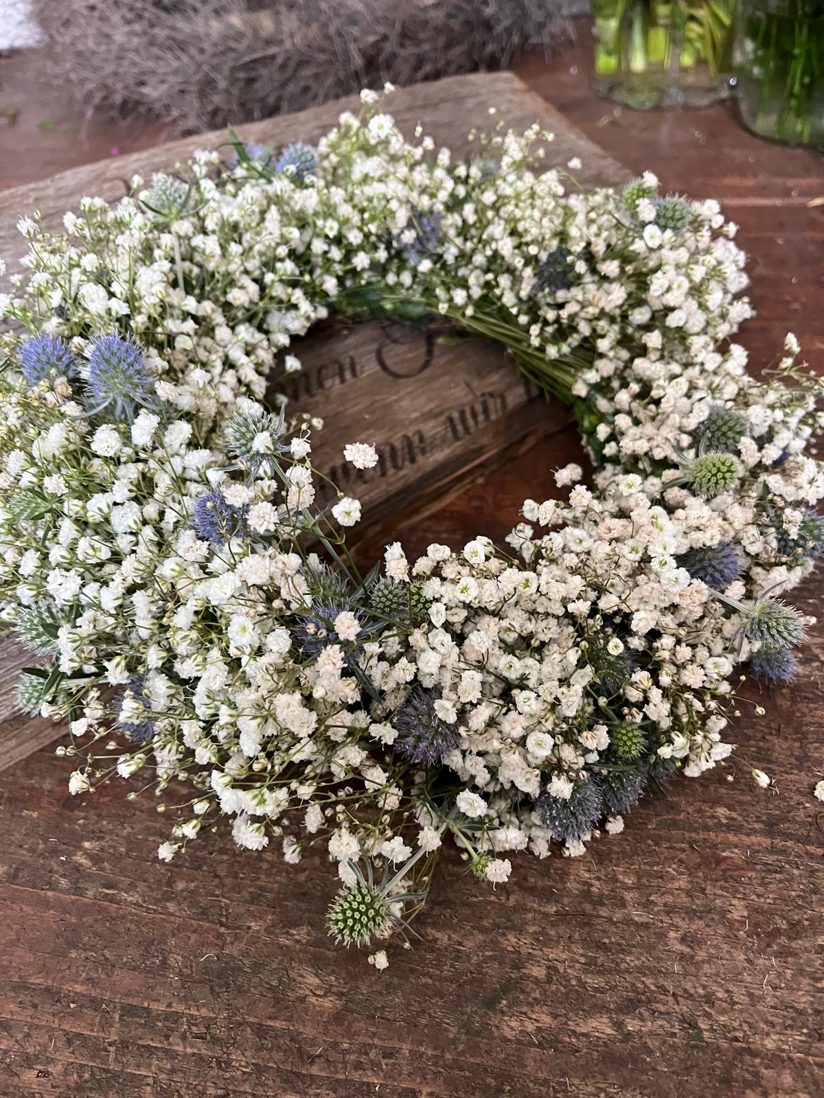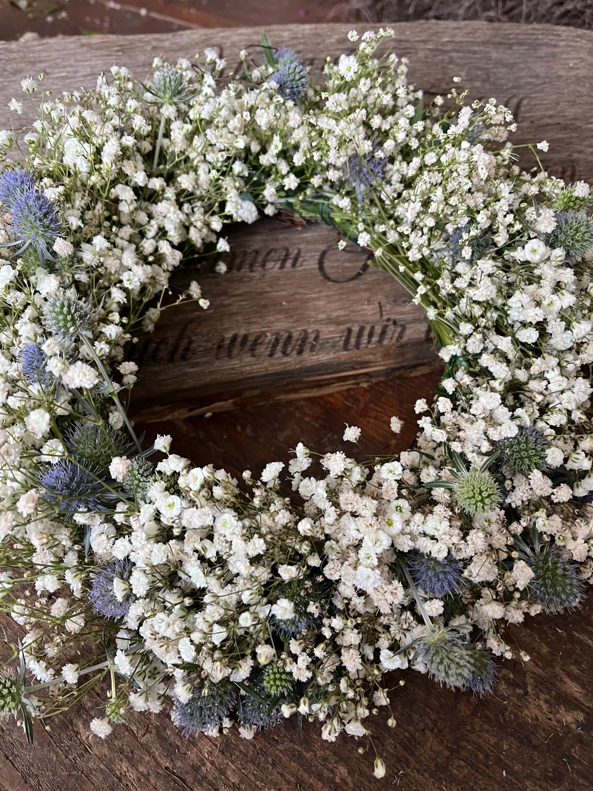 Wunderschöner Kranz aus frischem Schleierkraut und Disteln – mit viel Liebe zum Detail handgefertigt. Die Disteln variieren je nach Verfügbarkeit zwischen verschiedenen Blautönen und Silber, was jeden Kranz zu einem echten Unikat macht.