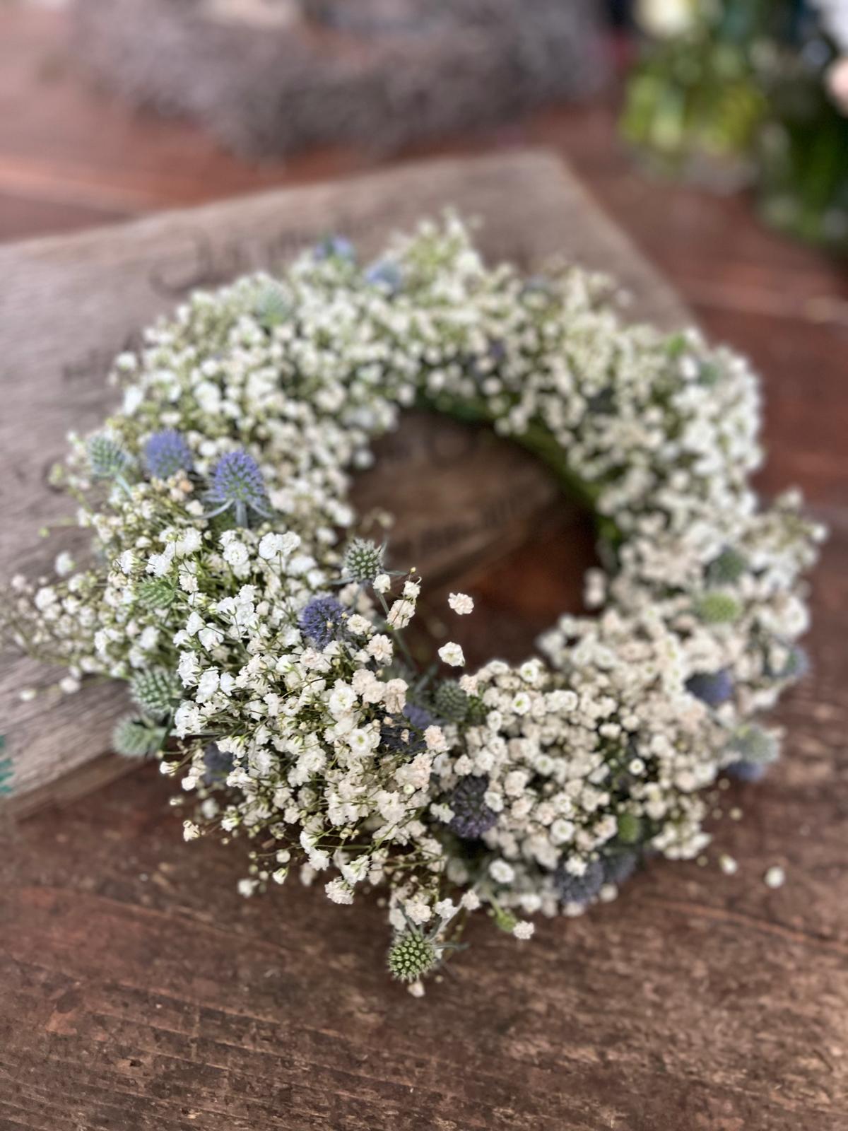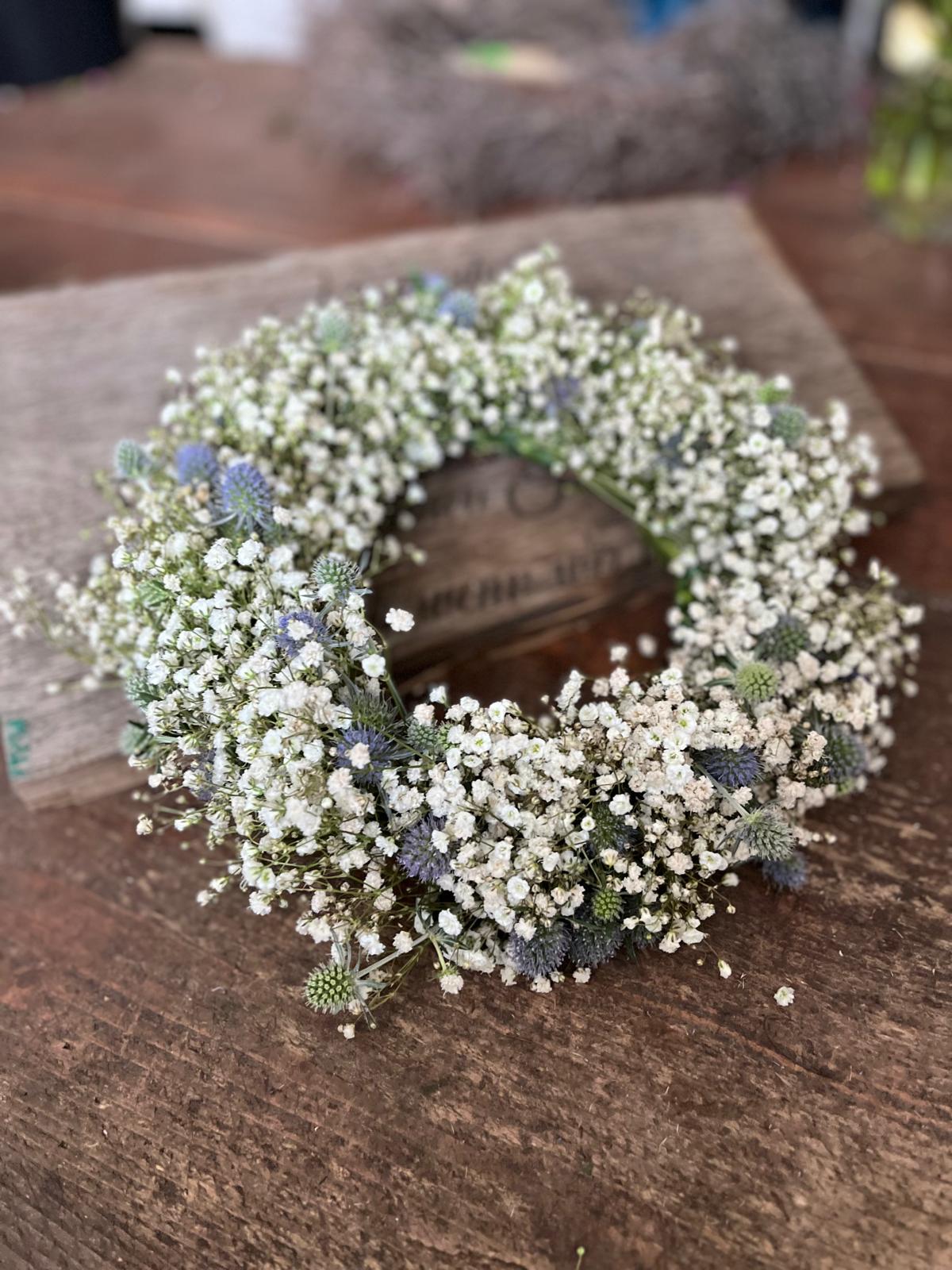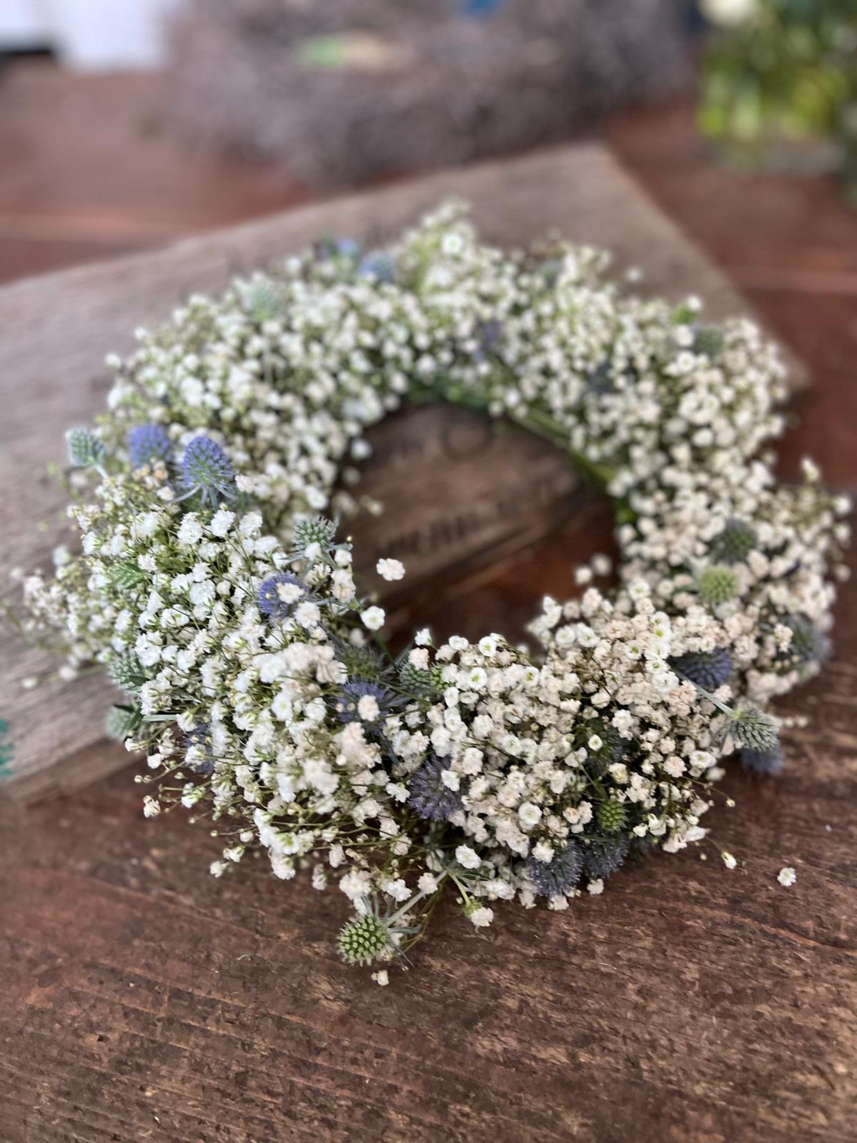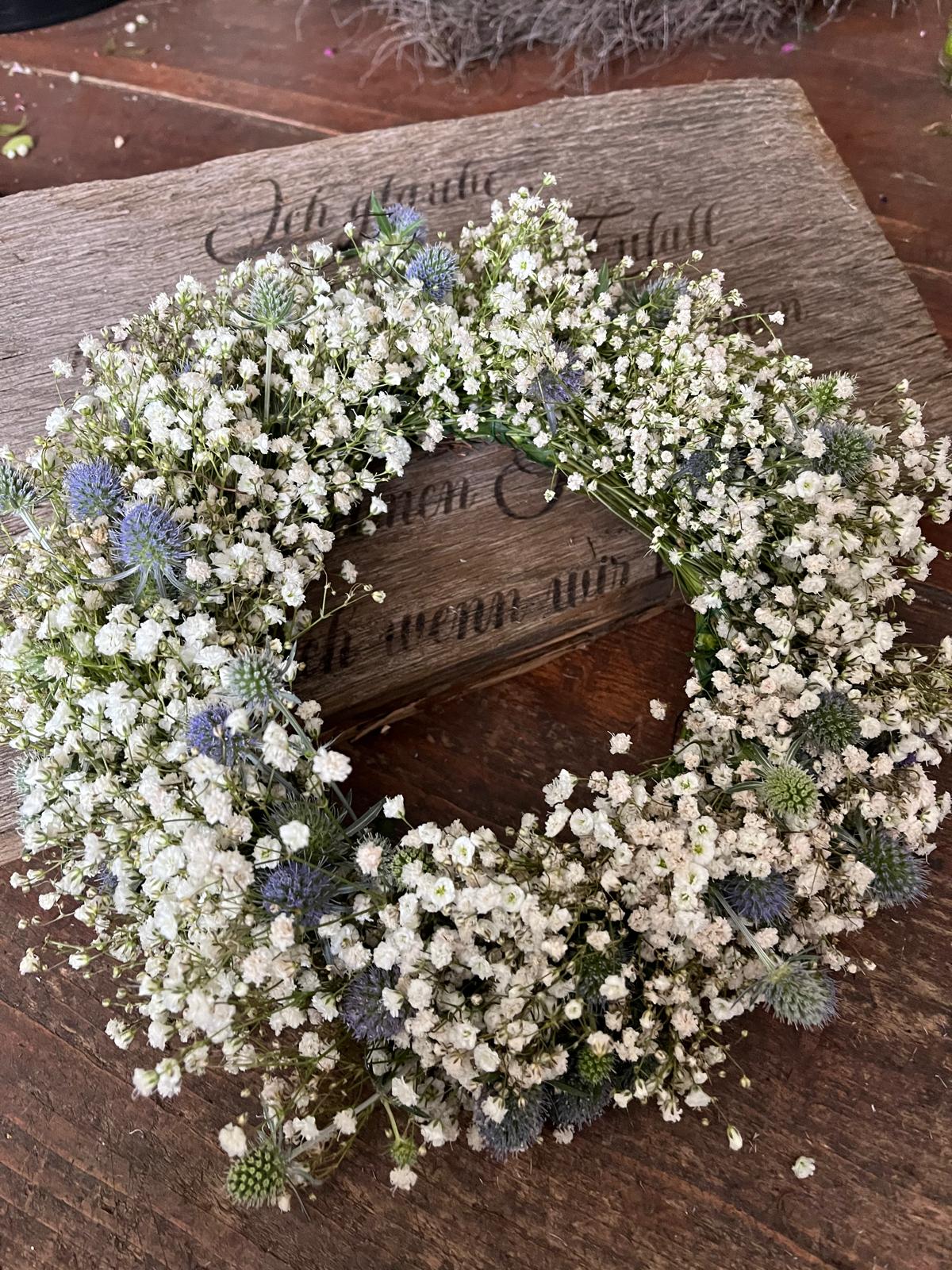 Wunderschöner Kranz aus frischem Schleierkraut und Disteln – mit viel Liebe zum Detail handgefertigt. Die Disteln variieren je nach Verfügbarkeit zwischen verschiedenen Blautönen und Silber, was jeden Kranz zu einem echten Unikat macht.