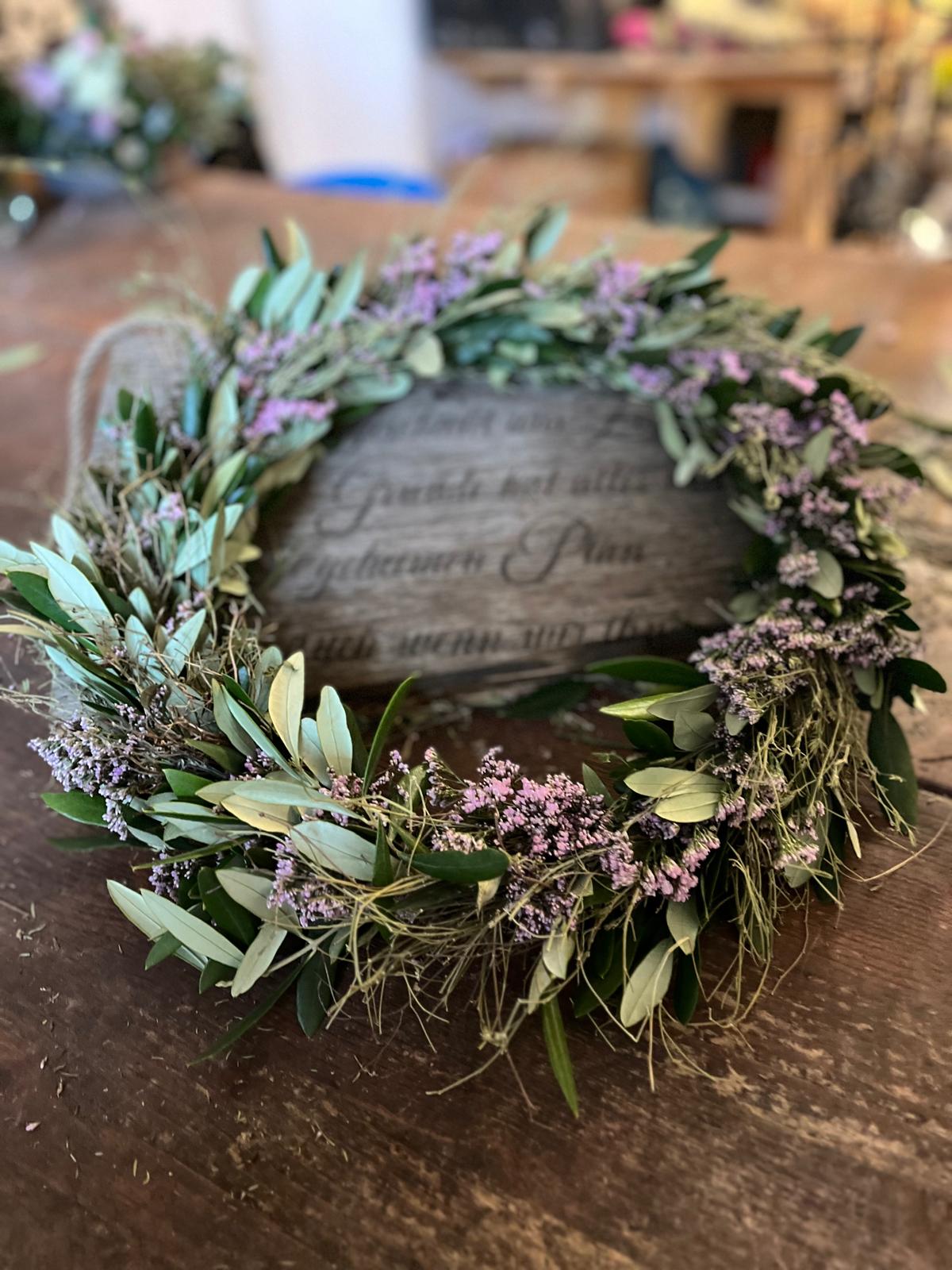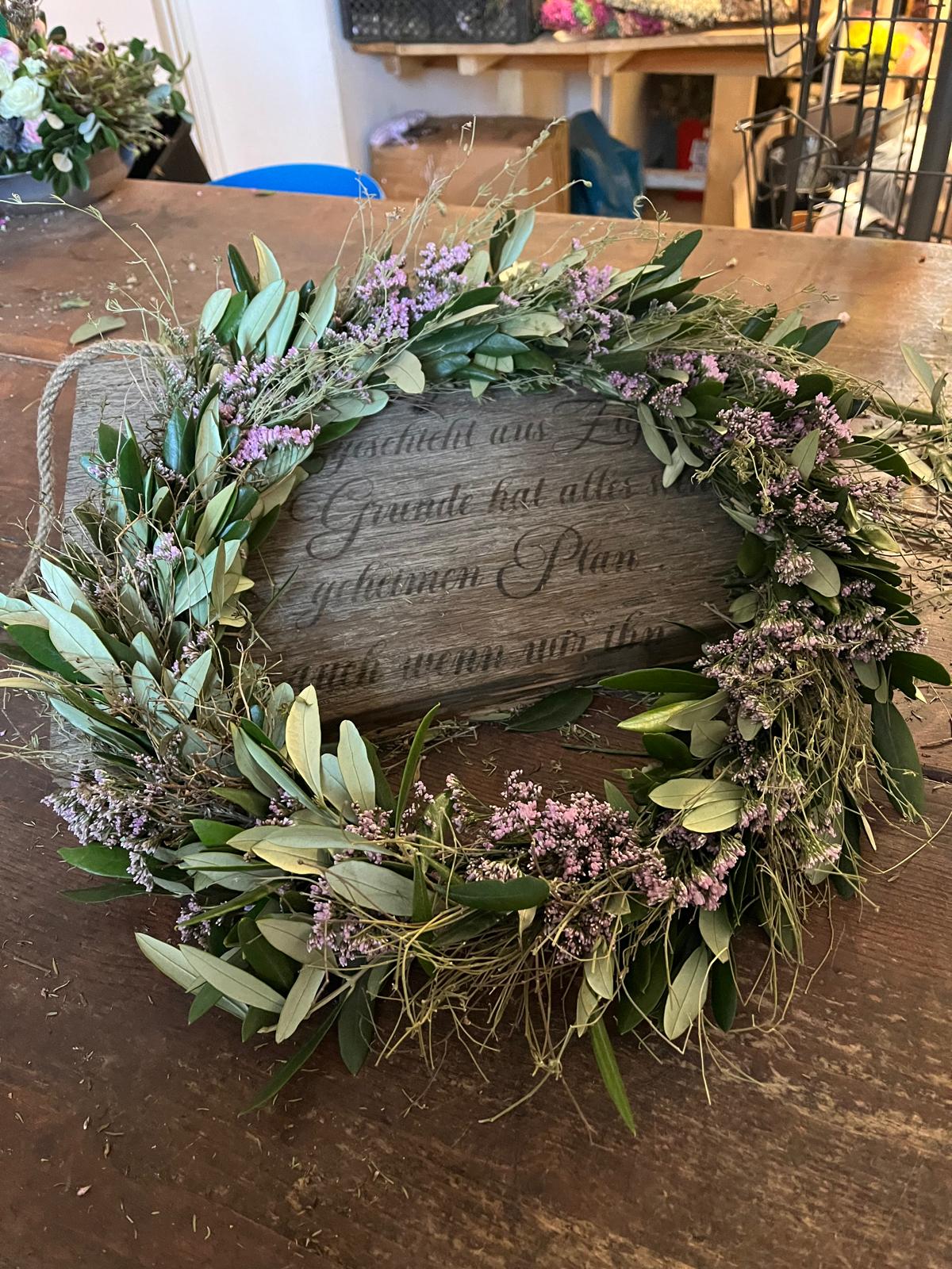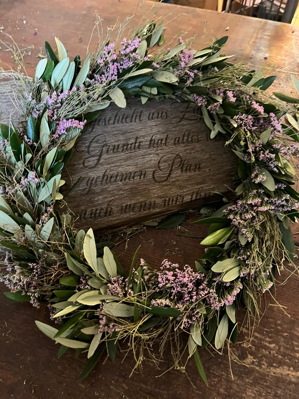 Ein wunderschöner, natürlicher Kranz aus Thymian, Strandflieder und Olive – liebevoll von Hand gebunden. Die Kombination aus zarten Blüten und aromatischen Kräutern sorgt für eine zeitlose, mediterrane Optik.