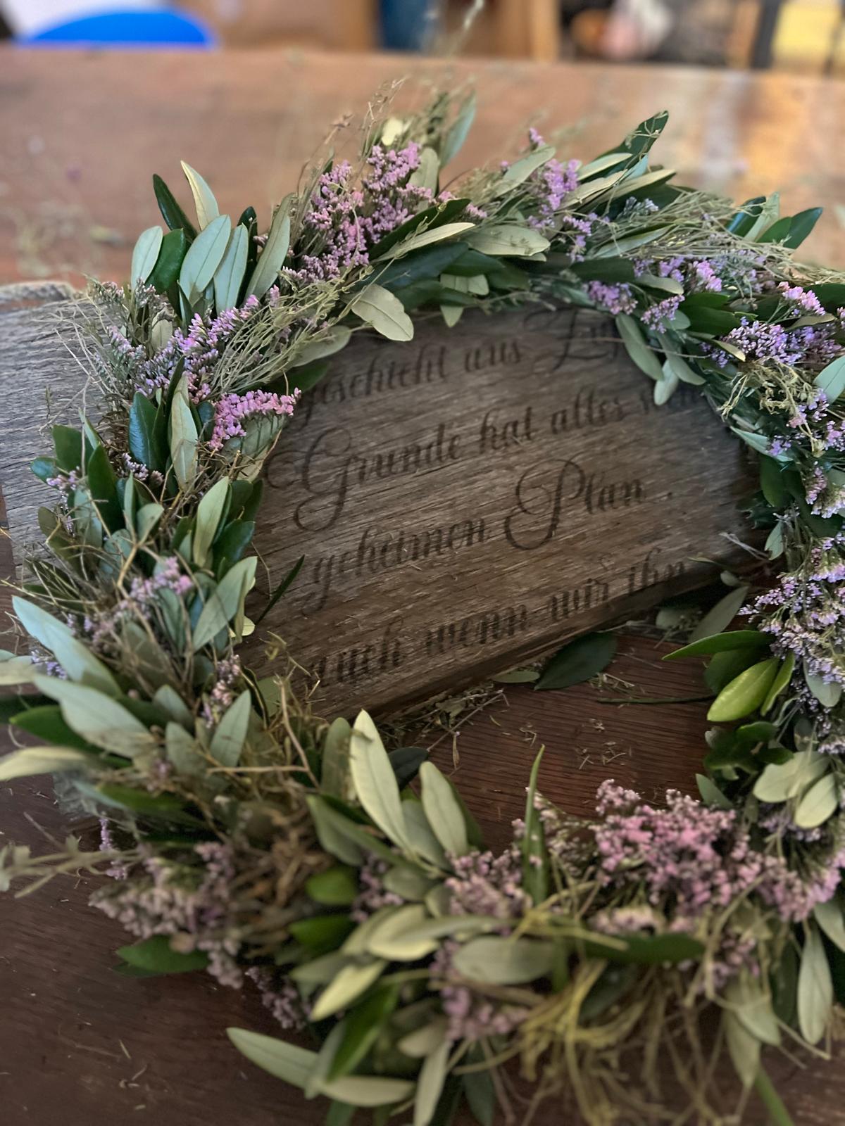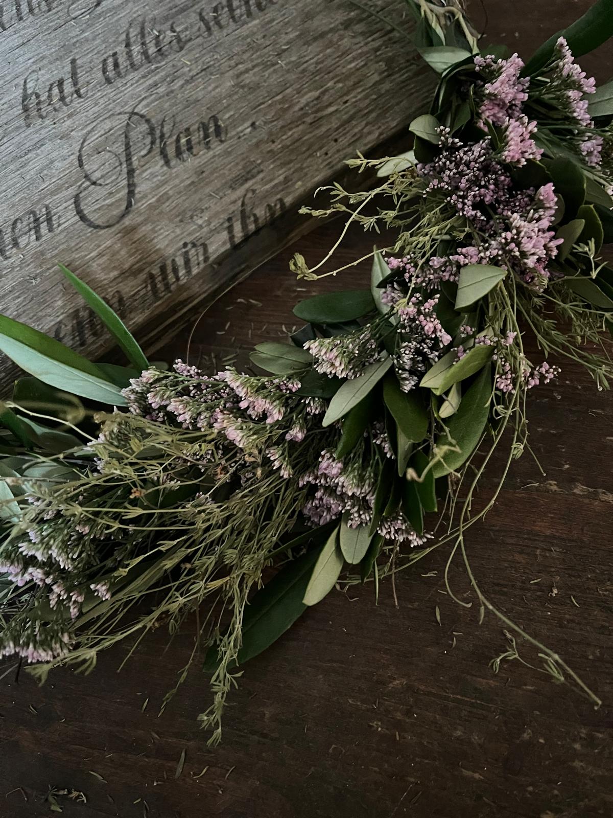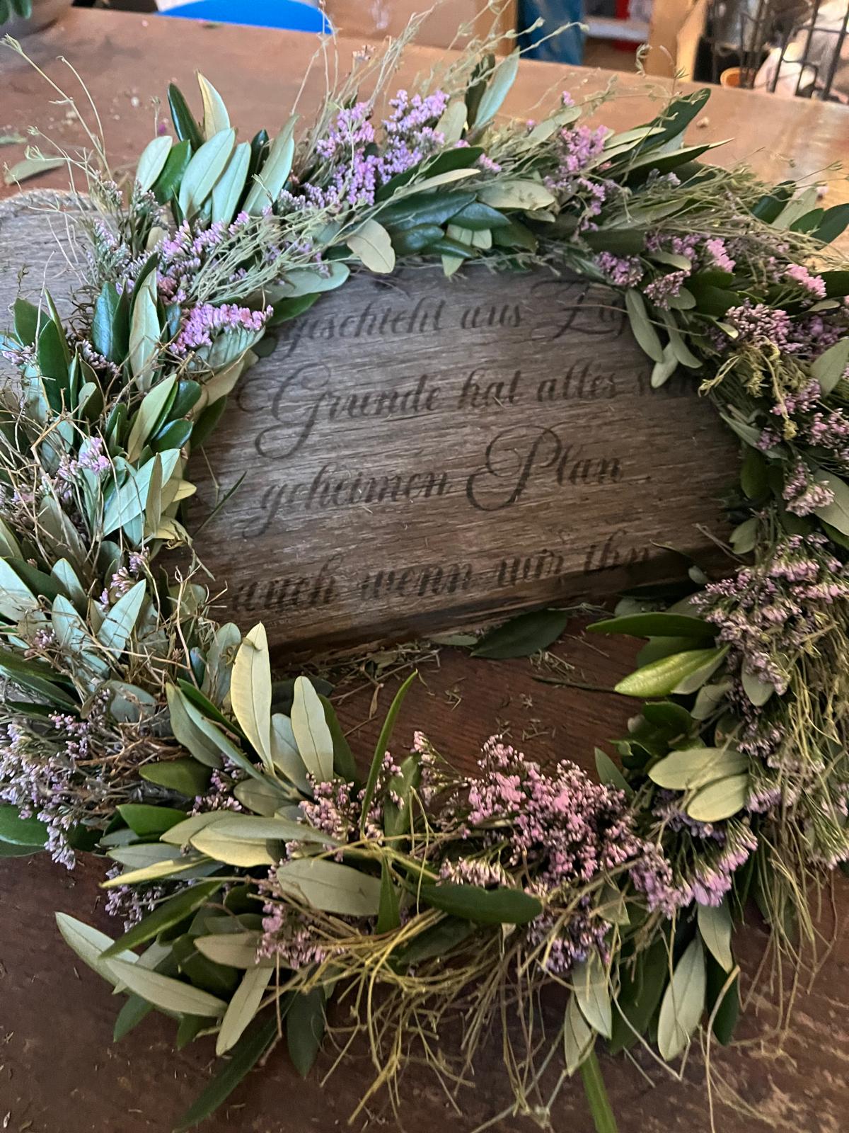 Ein wunderschöner, natürlicher Kranz aus Thymian, Strandflieder und Olive – liebevoll von Hand gebunden. Die Kombination aus zarten Blüten und aromatischen Kräutern sorgt für eine zeitlose, mediterrane Optik.