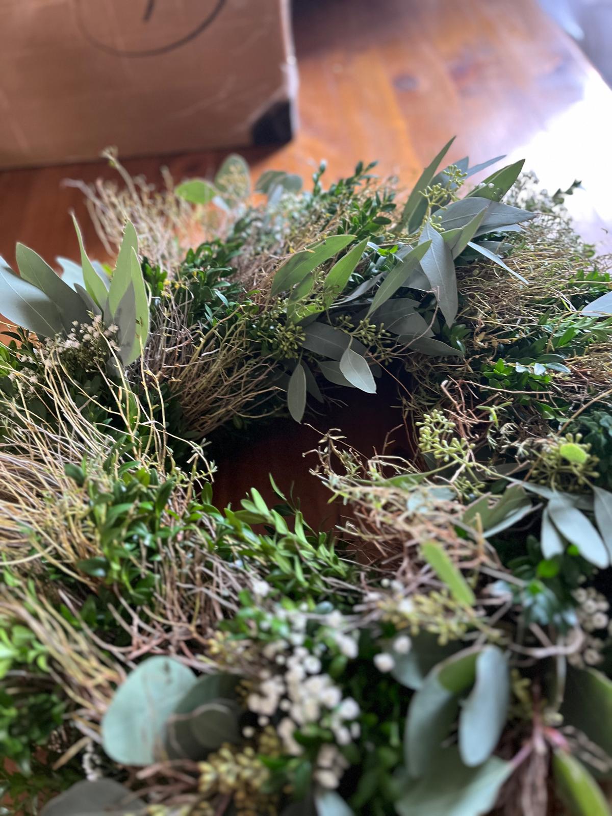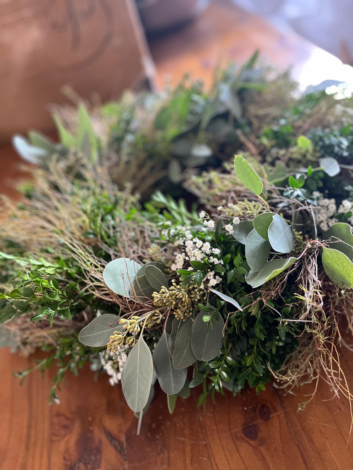 Edle Materialien: Eine harmonische Mischung aus Eukalyptus, Buchsbaum (Bux) und Thymian.